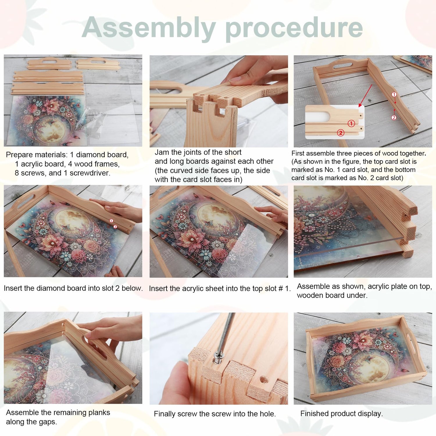 - Easy to Make—DIY diamond art food tray is a semi-finished product, young and old can do. Adequate tools are convenient for your crafts projects. This diamond art lap tray kit comes with diamond painting tools that allows you to complete. First tear off the protective film on the tea tray, then find the diamonds you need according to the number/letter on the non slip tray (the corresponding number/letter is marked on the bag) to start making. Lastly, place the diamond painting on the wood frame