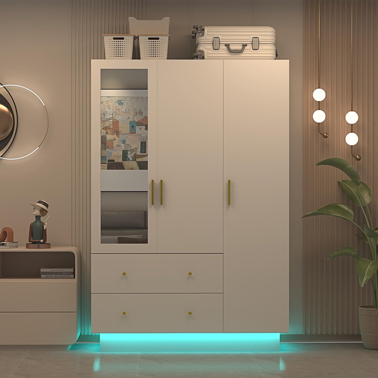 - RGB LED Light】Bedroom armoire with drawers has built-in 60,000-color LED lights and multiple flashing modes. Smart RGB LED light is controlled by APP and remote control. The integrated music synchronization function changes the color of the lights in response to the rhythm of sound and music, giving your bedroom a warm atmosphere