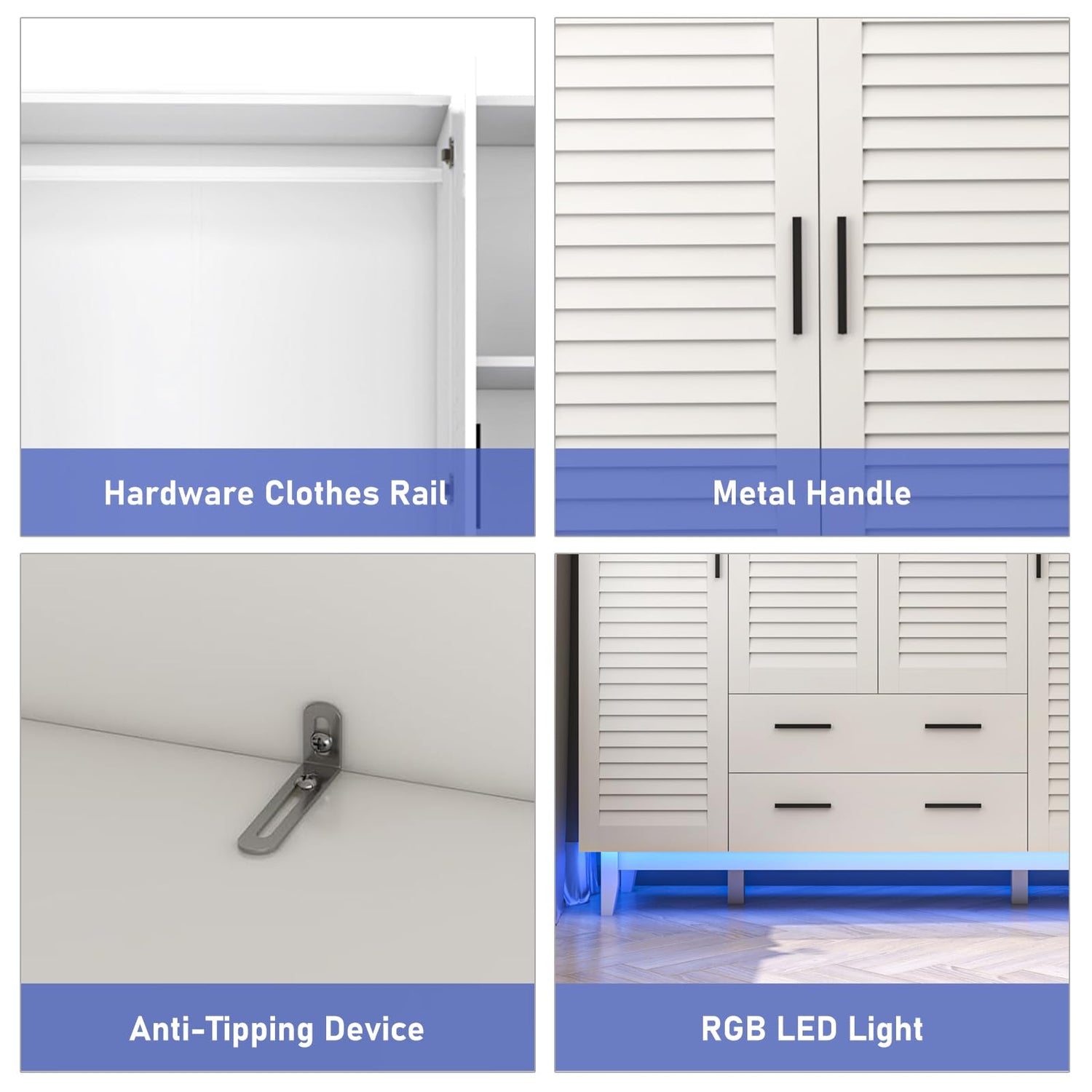jiteentarou 4 Door Armoire Wardrobe Closet Cabinet with Drawers and LED Lights, Multi-Tier Shelves, Hanging Rod & 4 Louver Doors, Large Capacity Storage Wardrobe Armoire for Bedroom(4 Doors White)