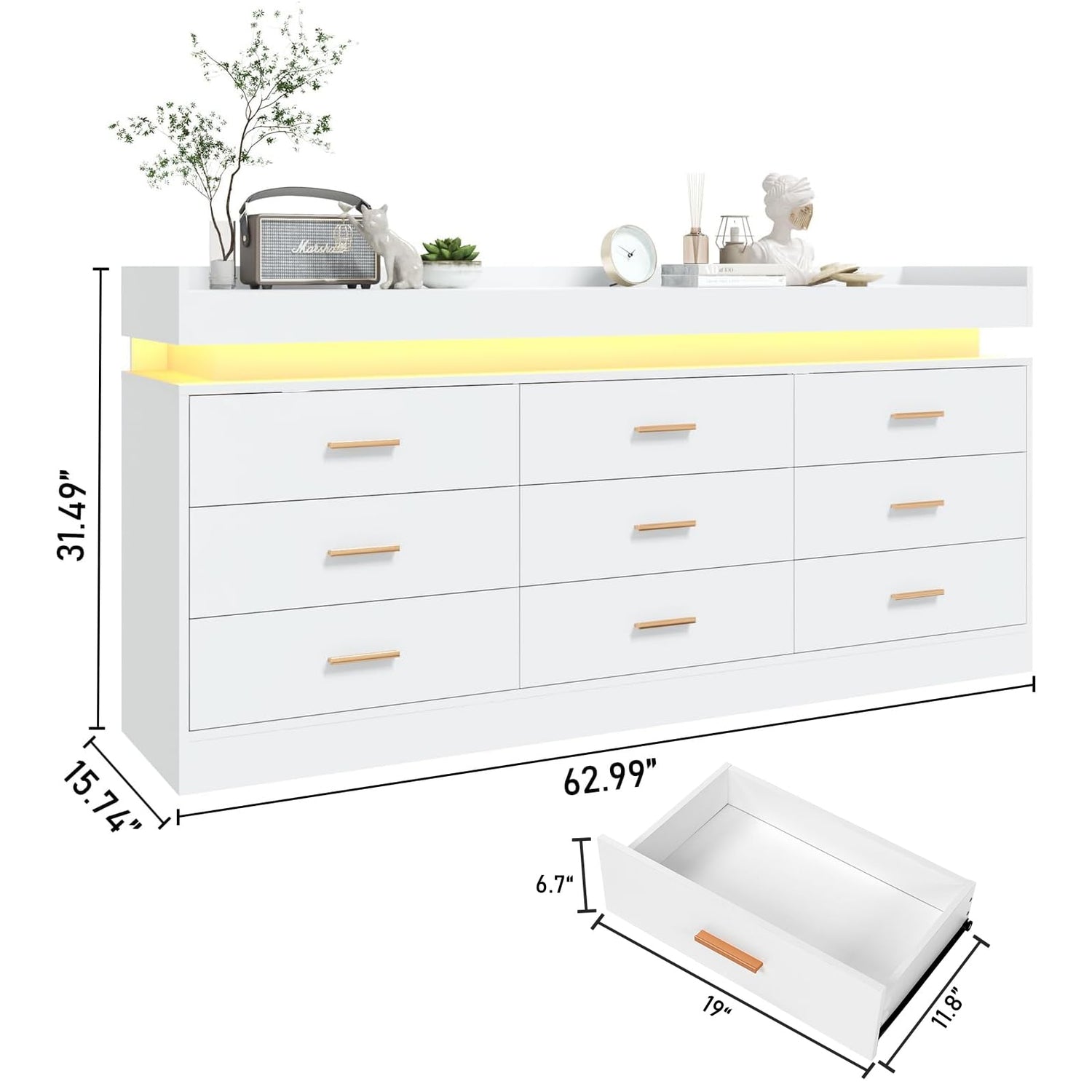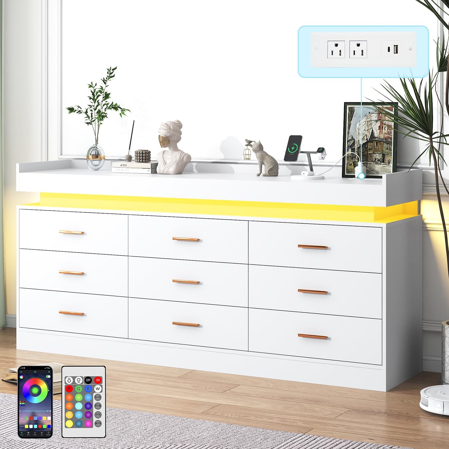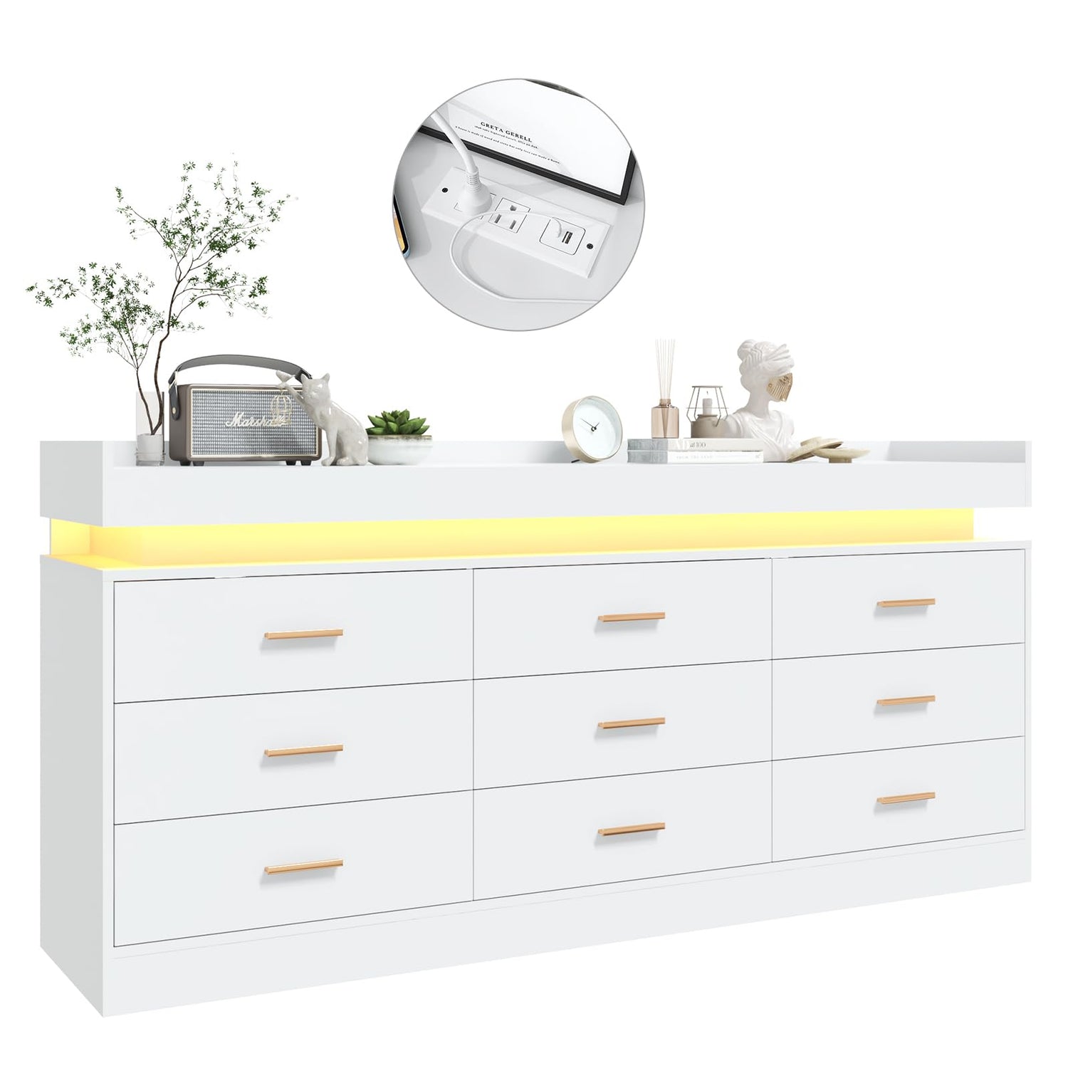 jiteentarou 9 Drawer Dresser with Charging Station and LED Lights, Modern Chest of Drawers with Power Outlet, Organizer Cabinet for Bedroom, Living Room, Entryway, White