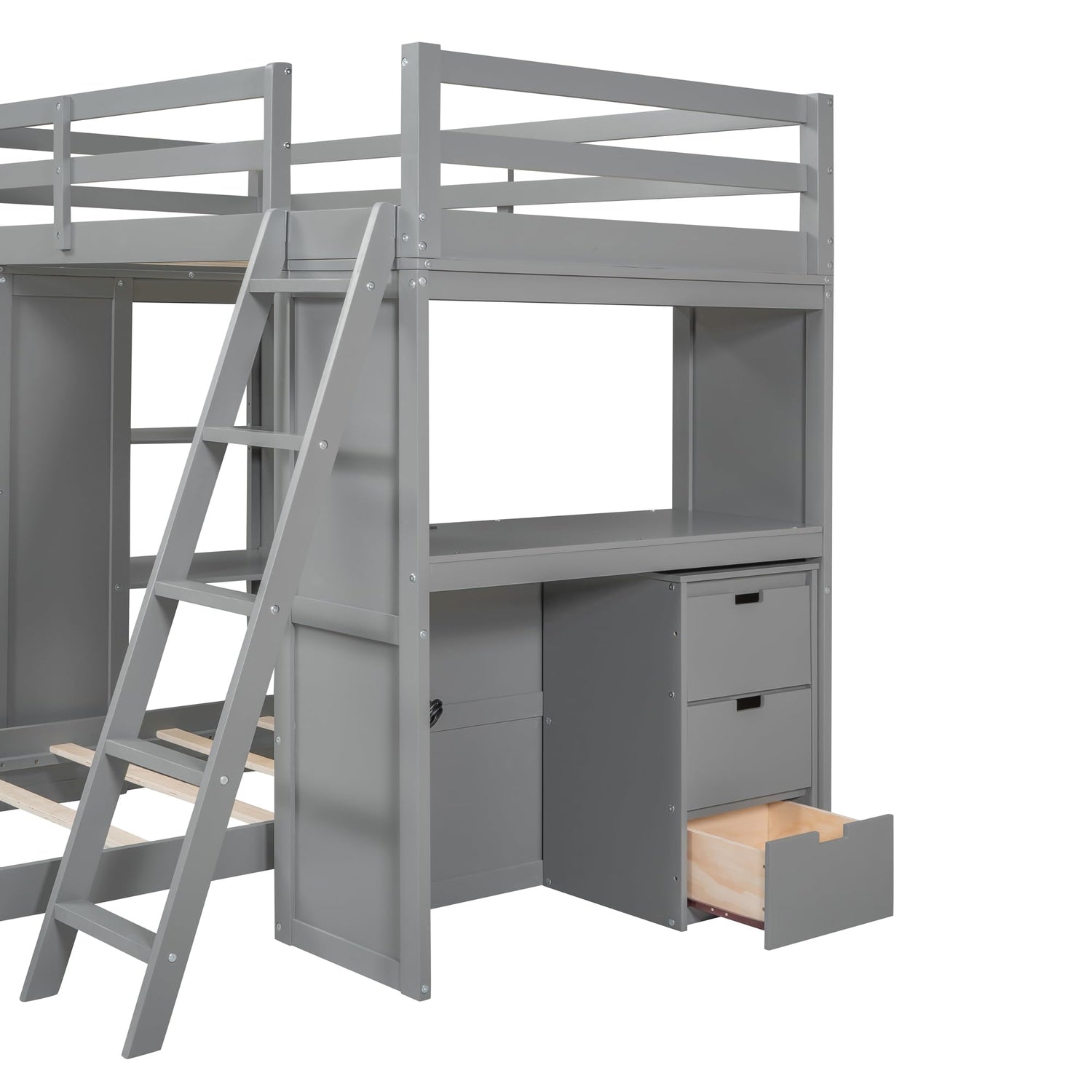 JIVOIT L-Shaped Twin Over Twin Bunk Bed with LED Light, USB Ports, Desk, Drawers, and Open Shelves in Gray