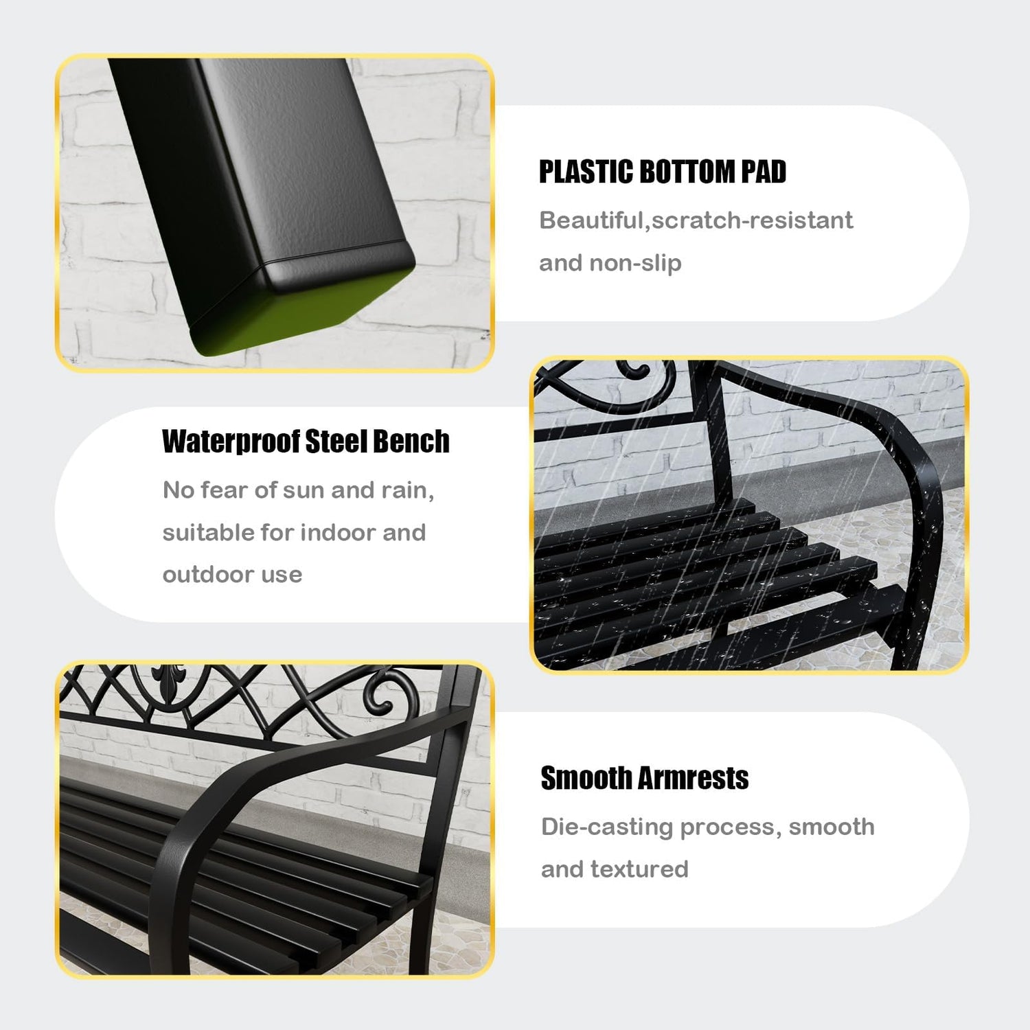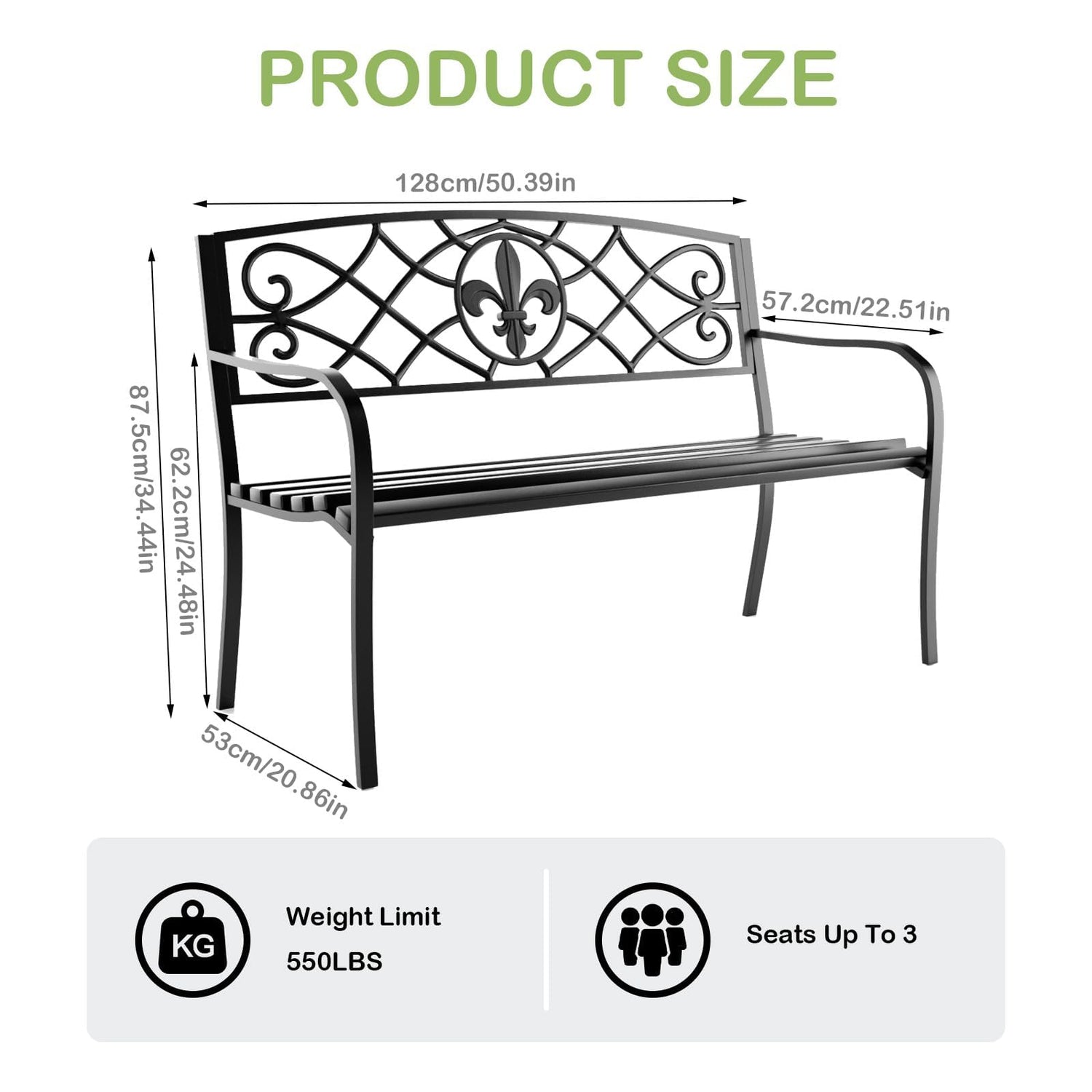 - Weather-resistant Design : Our Wrought Iron Bench is coated with anti-rust and fade-resistant finishes, making it resistant to rust, UV rays, and all weather conditions. With dimensions of 50.39"(L) x 22.51"(W) x 34.44"(H), this bench is a stylish and durable addition to your outdoor space