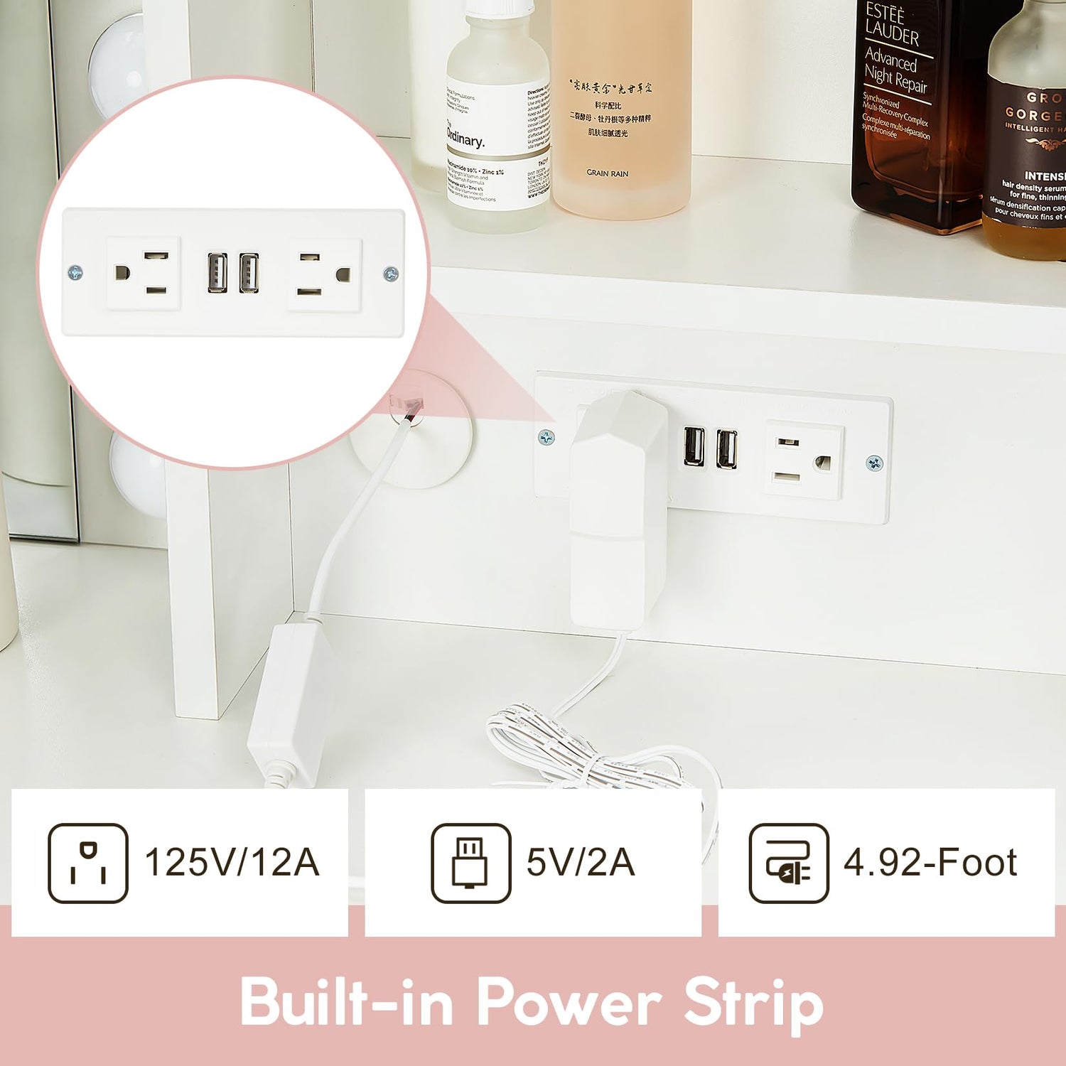 - Built-in Charging Station: The makeup vanity table's built-in charging station adds convenience to your beauty routine. With plug sockets and USB ports, you can easily charge your beauty tools and devices, such as hair dryers, curling irons, or smartphones, without the need for additional power outlets or adapters.