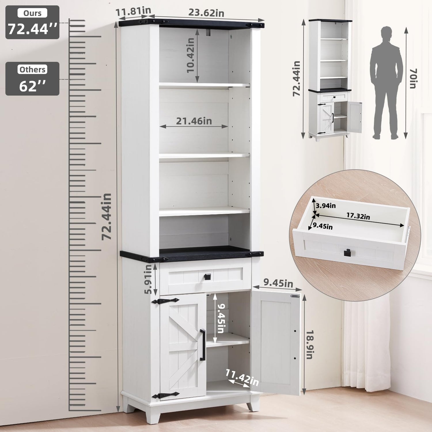 - Pantry Cabinet with Drawer and Barn Doors: Upgrade your kitchen or dining room with these stylish and functional kitchen cabinets. The adjustable shelves and unique drawer and barn-style doors design offer ample storage space for food, spices, dishes, and more while adding rustic charm to your space.