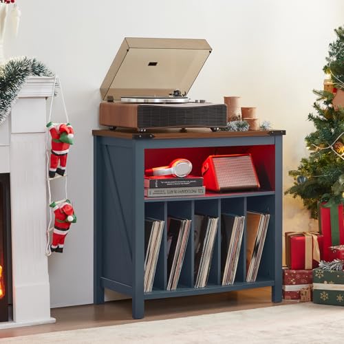 - [Large Storage Space】:The turntable Stand is 29.92 "L x 15.75" W x 30.59 "H. The middle shelf can hold speakers, decorations and records. The five open compartments at the bottom can be used to store different styles of ablums or books for easy selection. The record shelf can hold up to 230 records. A 2.3 inch round hole is designed on the backboard to facilitate the arrangement of power cables and charging cables for a cleaner desktop.