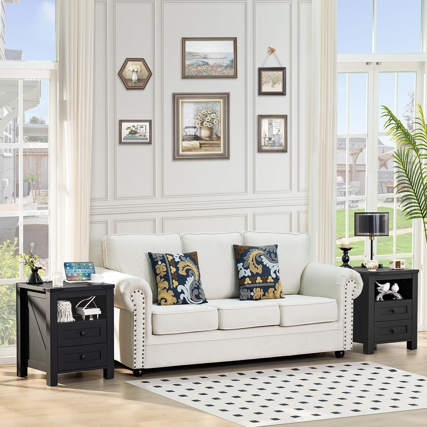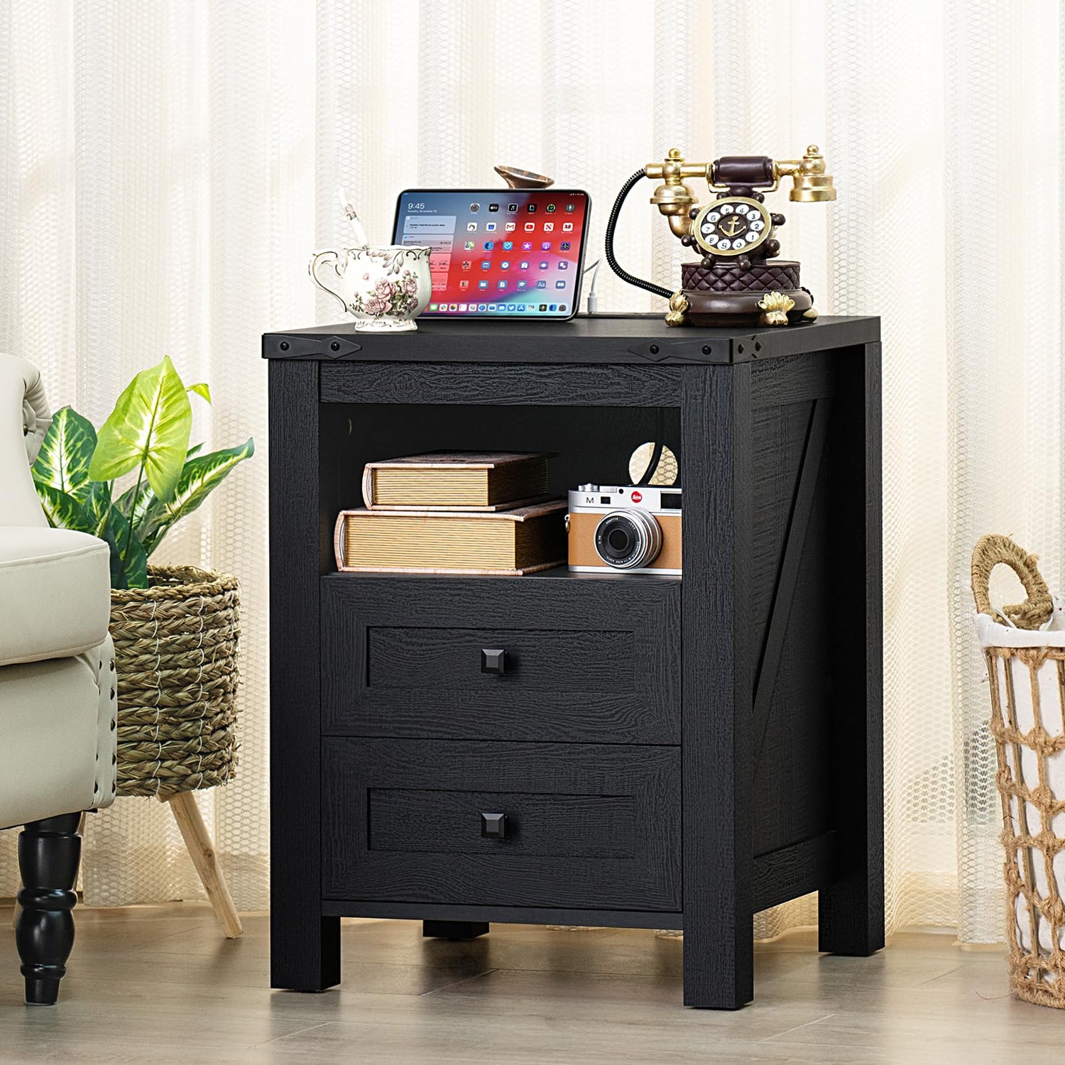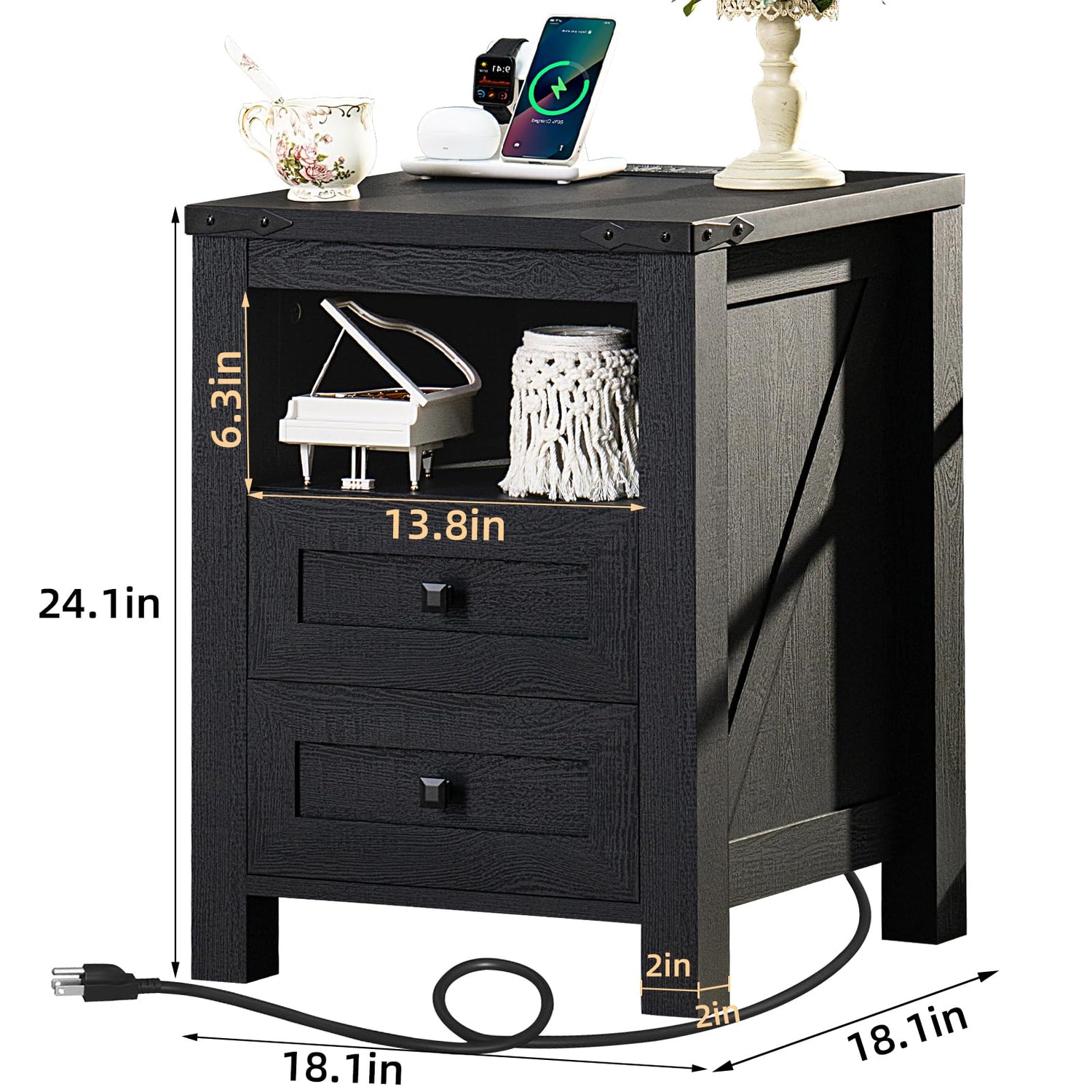 Joaxswe Nightstand with Charging Station and USB Port, Farmhouse Night Stand with 2 Drawers and Shelf Storage, Wooden Side End Table, Bedside Cabinet for Bedroom, Living Room, Closet,Office (Black)