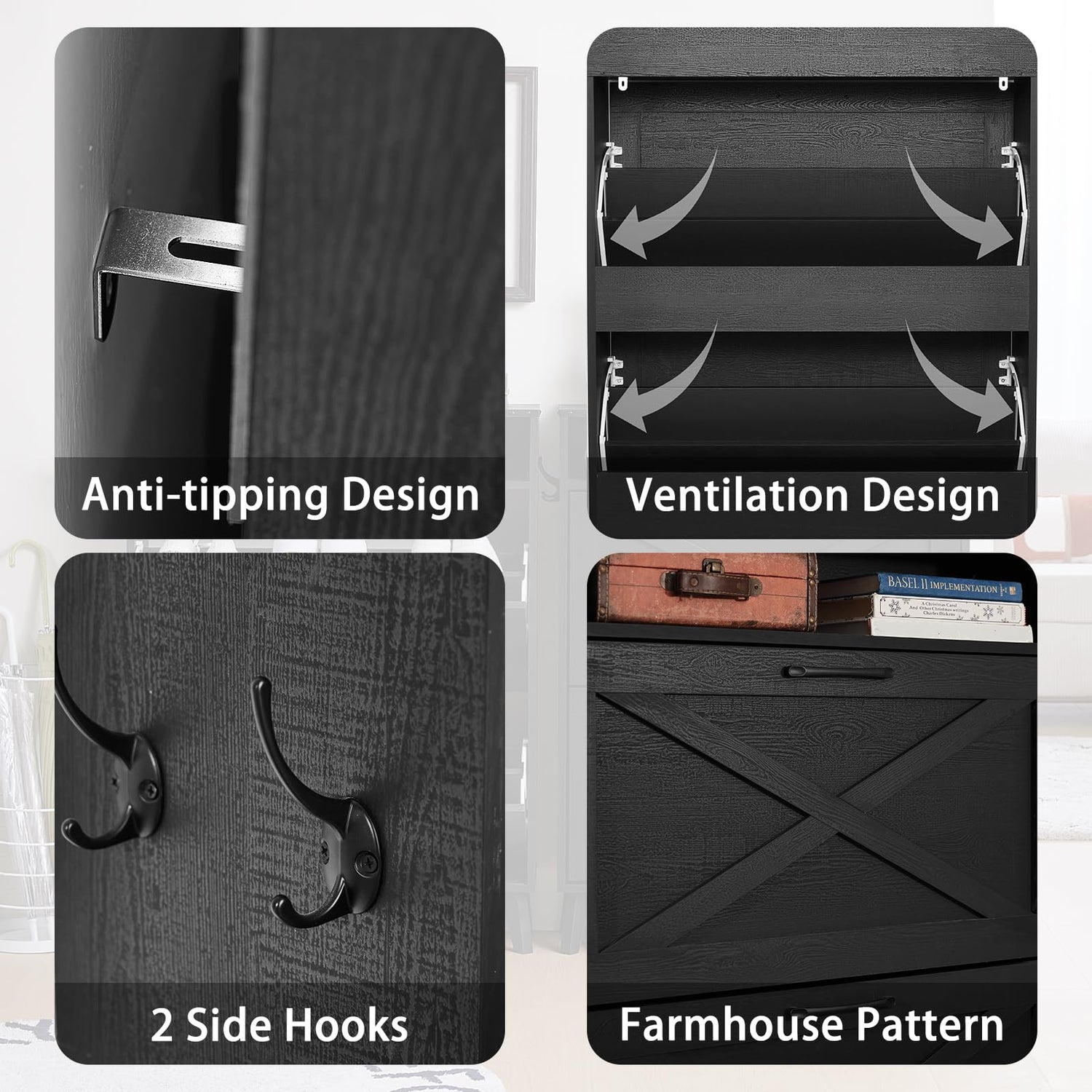 - [Entryway Narrow Shoe Cabinet] The hidden shoe cabinet is designed with two barn door flip up drawers, which is easy to open and close. This freestanding shoe storage cabinet helps you make the most of your wall space to store your shoes, saving space while keeping them away from dust. You can place it in your entryway, hallway or porch to add a farmhouse feel to your home while keeping it tidy.