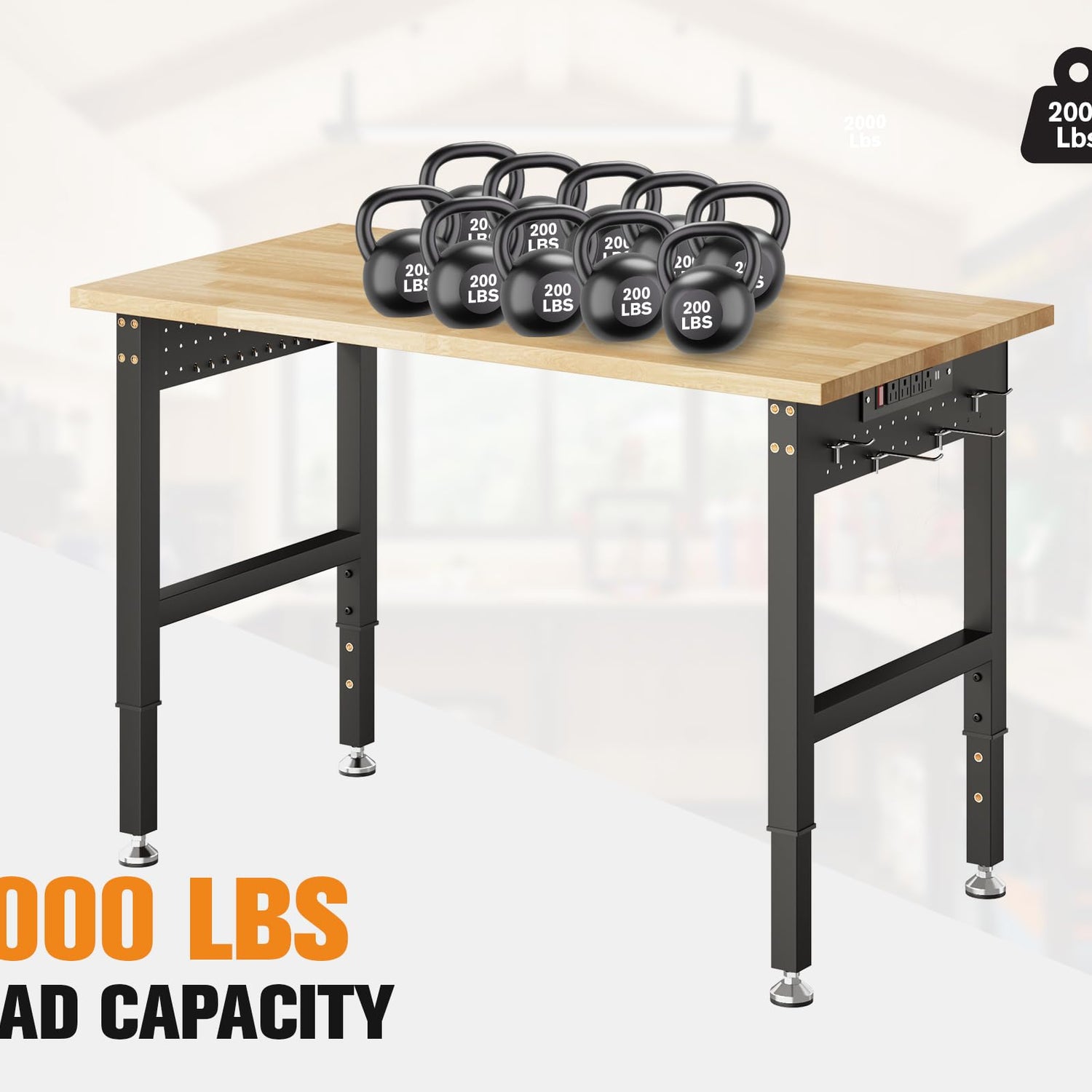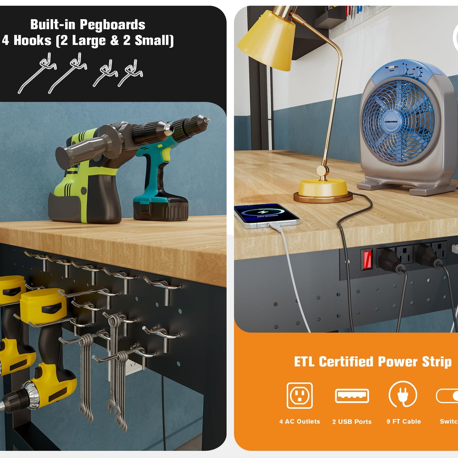 - Integrated Pegboard: Built-in pegboards by the sides, workbenches comes with 4 hooks. Keep your tools organized and easy to reach. Customize your workspace to suit your needs.