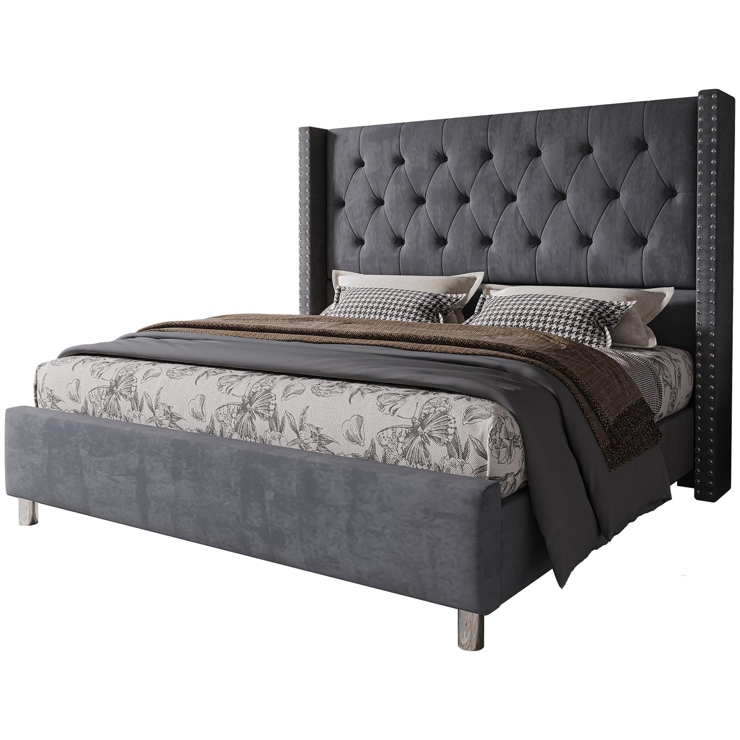 Jocisland Bed Frame King Size Velvet Tufted Upholstered Bed Low Profile Platform Bed Raised Wingback Headboard/Wood Slats Support/No Box Spring Needed/Easy Assembly/Grey