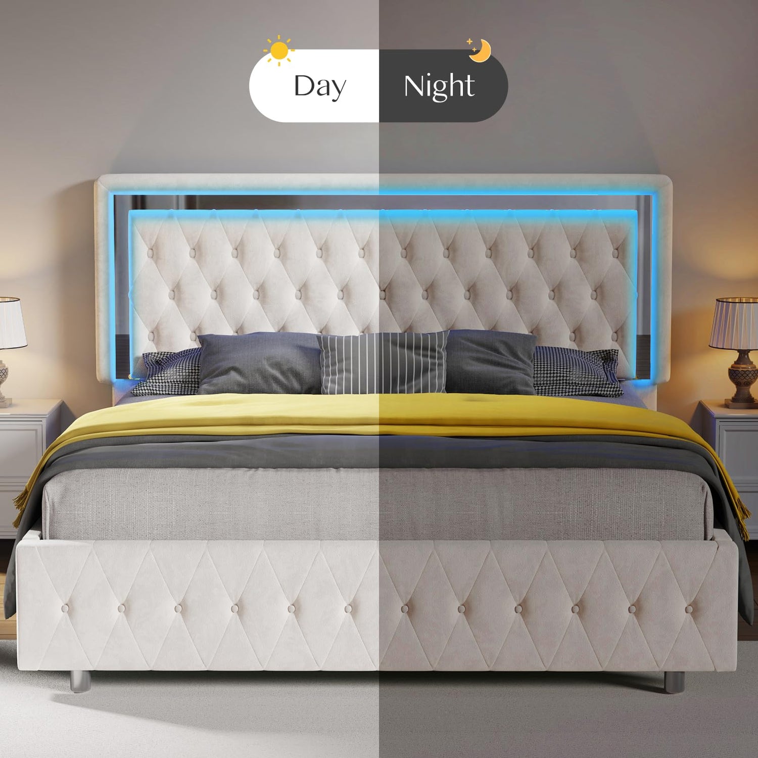 - Smarter LED Bed Frame: Freely adjust over 6000 colors, brightness, mode, timing fuction via APP or remote. Lights flash in various music modes, helding party in your bedroom.
