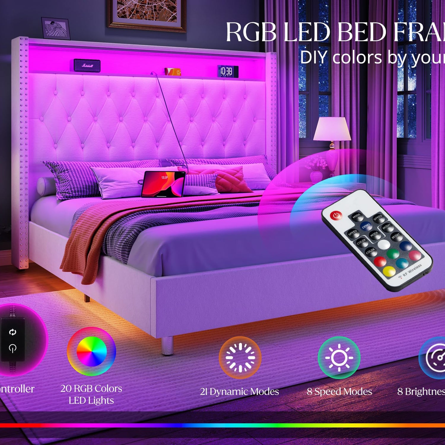 - RGB LED Mood Lighting: Create the perfect atmosphere with 20 adjustable RGB colors. Conveniently controlled by remote, this LED strip offers soft ambient lighting or vibrant hues to brighten your nights, making relaxation even more enjoyable.
