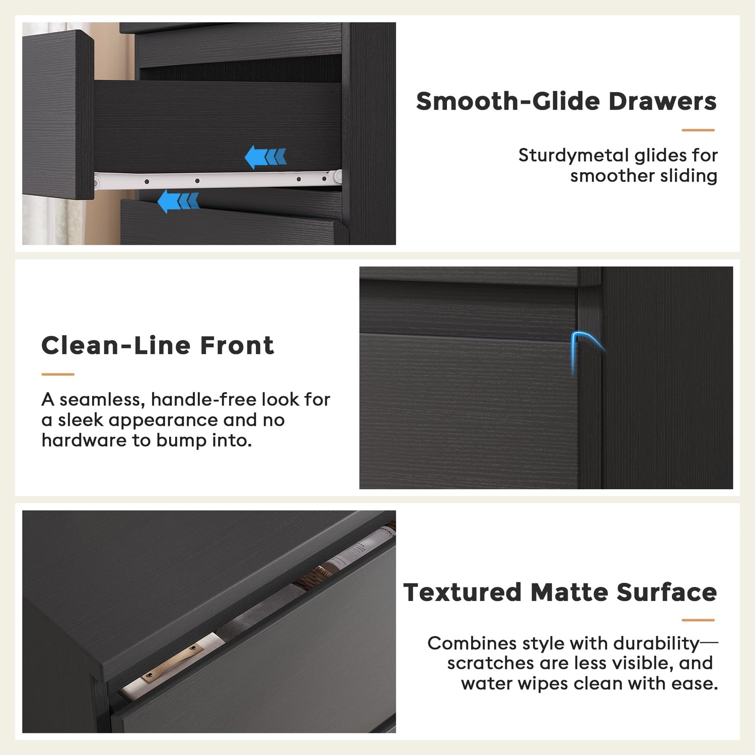 - BUILT TO LAST WITH PREMIUM MATERIALS: Crafted from durable MDF wood and robust metal slides, this dresser promises longevity. The thickened top resists scratches, repels water, and wipes clean easily. Reinforced construction ensures exceptional stability and strong load capacity. Deep drawers glide smoothly and silently on quality metal rails, plus includes an anti-tip kit for added safety