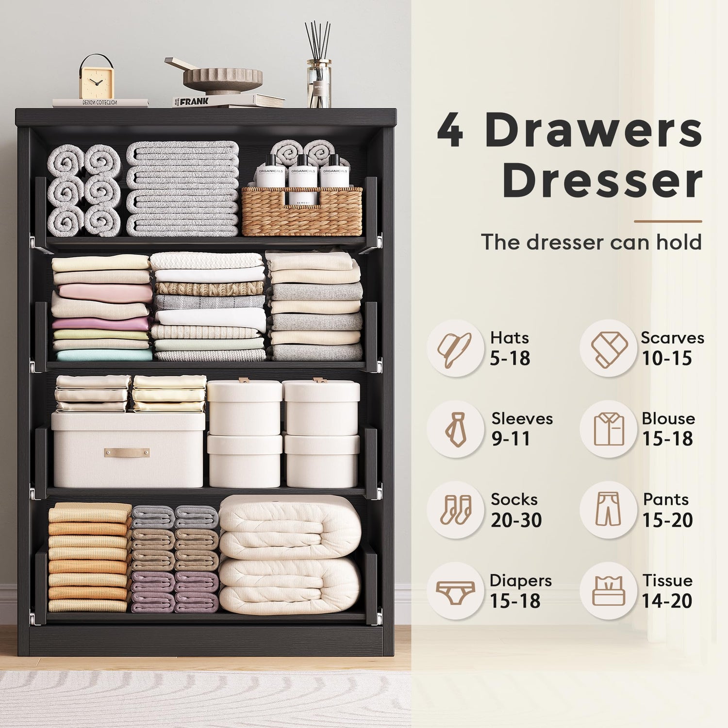 - MASSIVE STORAGE CAPACITY (23.6" W x 15.4" D x 32.5" H): Experience ample organization with 4 deep, smooth-gliding drawers. Effortlessly store clothing, linens, accessories, and more for the whole family. Keep everything sorted and within reach. The spacious top surface is ideal for displaying décor, photos, or a lamp, helping you maintain a tidy space. Hello, clutter-free life