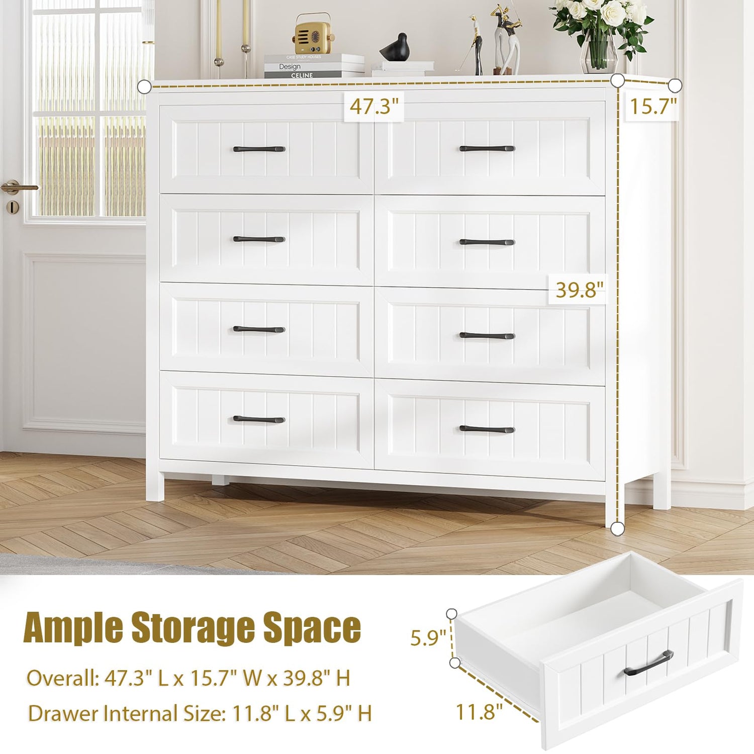 - * AMPLE STORAGE: Measuring 47.3" L x 39.8" H x 15.7" W, larger size. This farmhouse dresser features 8 spacious smooth-glide drawers, providing versatile storage to easily organize your and your family's clothes, socks or other personal items. The ample drawer space ensures items are kept sorted and easily accessible, while the spacious wooden dresser top is ideal for placing your favorite display decors, photos and lamps, keeping your space neat and tidy. Bid farewell to clutter.