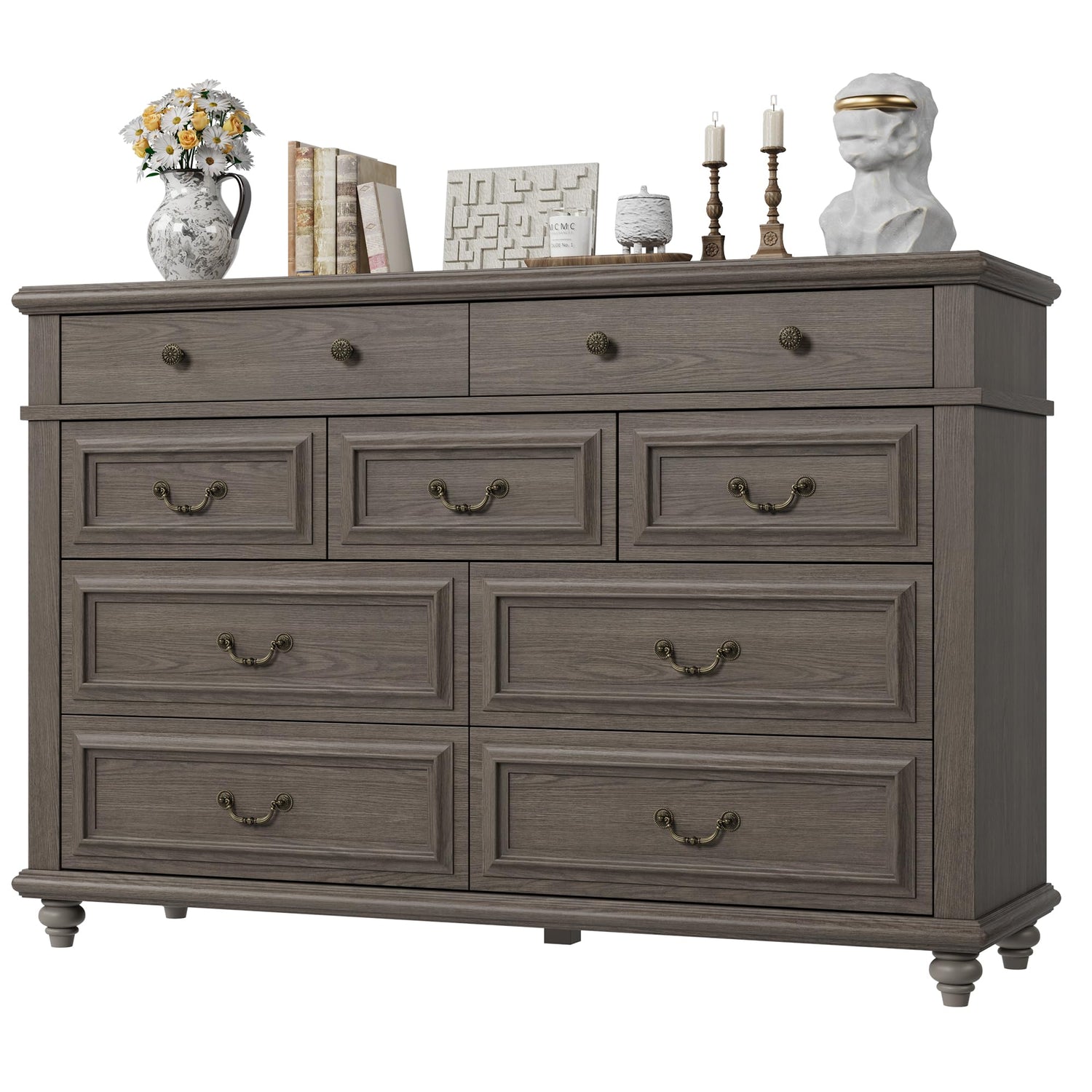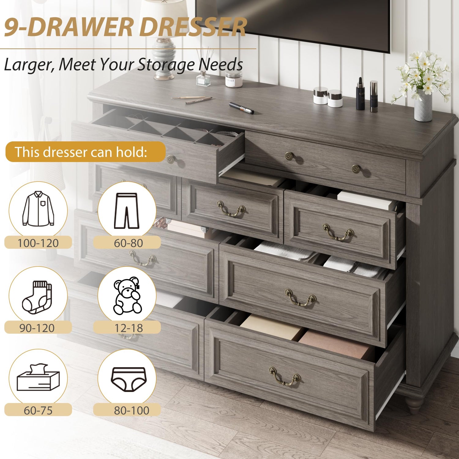 - * MULTIFUNCTIONAL DRESSER: This grey dresser offers various placement options for your room. Beyond being a storage cabinet in the bedroom, it serves as a entryway dresser to put daily items and overflow, or even as a TV dresser in the living room for odds and ends. The classic farmhouse dressers are suitable for most styles of homes, can be integrated into different scenes, such as bedroom, living room, closets, hallway, and entryway etc. The 9 dresser with drawers can fit them perfectly.