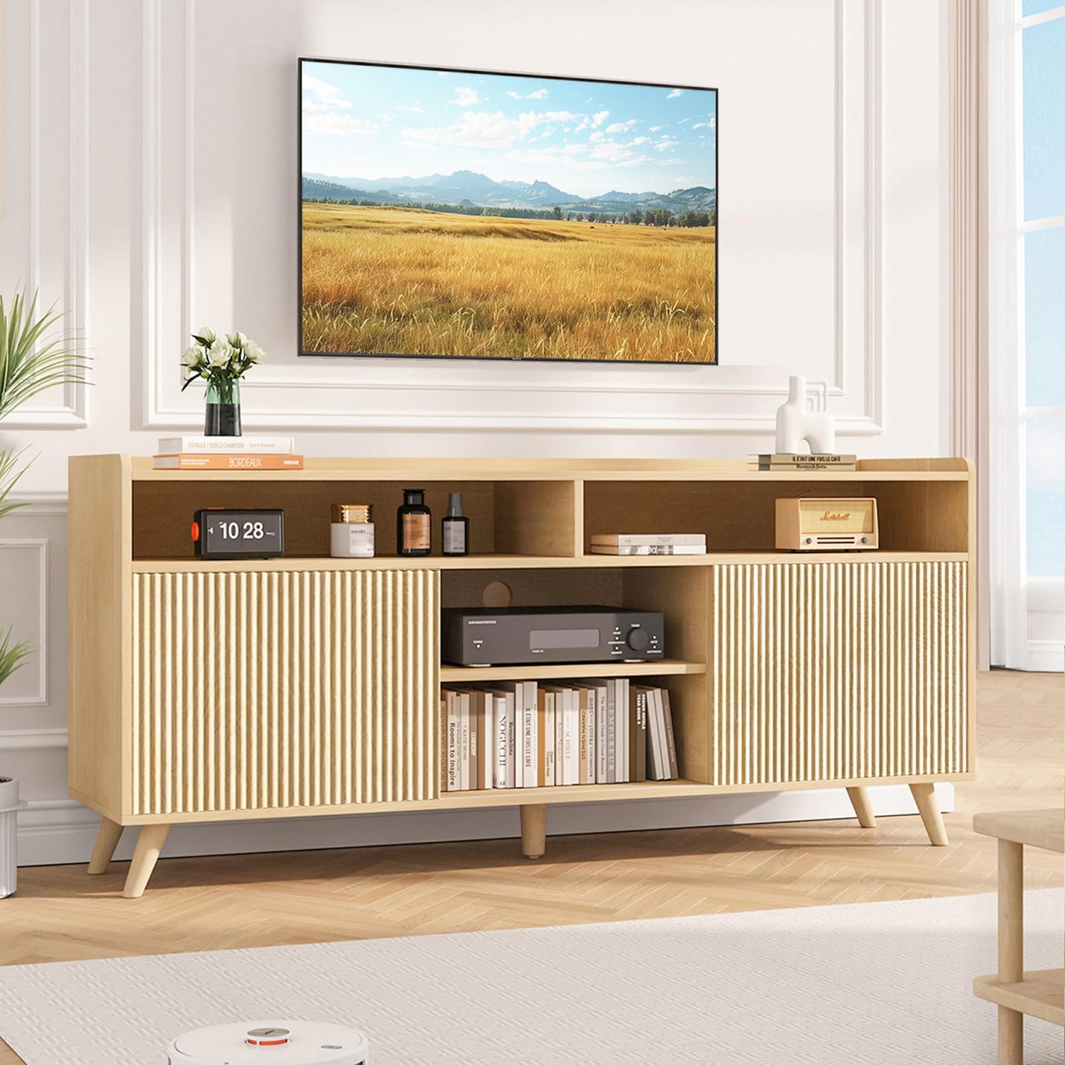 Jocoevol Fluted TV Stand for 65 Inch Boho Entertainment Center With Storage, Wood Media Console Cabinet With Shelves and Doors, Living Room Furniture for Bedroom, Natural Oak
