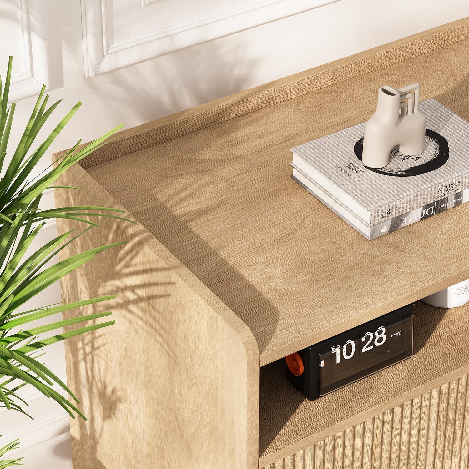 - √ CHIC ENTERTAINMENT CENTER: This boho entertainment center features 2 upgraded sliding doors for smooth operation, making it easy to access your items while allowing you to conceal or showcase your fluted TV stand, you can flexibly organize it into different storage and display areas. The shelves of this TV media console are adjustable to 3 heights, so you can easily customize the space for your needs without any reinstallation. This TV stand cleverly keeps clutter—big or small—out of sight.