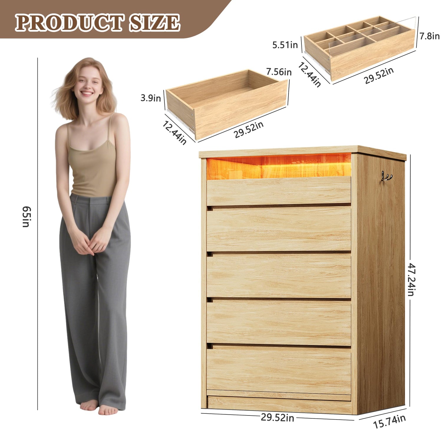 - DYNAMIC RGB LED LIGHTING EXPERIENCE: Elevate your oak tall dresser with built-in customizable lighting! Control over 6000 vibrant colors via the app/remote to create a variety of ambiences from relaxing tones to party vibes. Easily adjust brightness, dynamic mode and strobe effects. This modern bedroom dresser combines practical functionality with a stylish vibe to become a striking piece