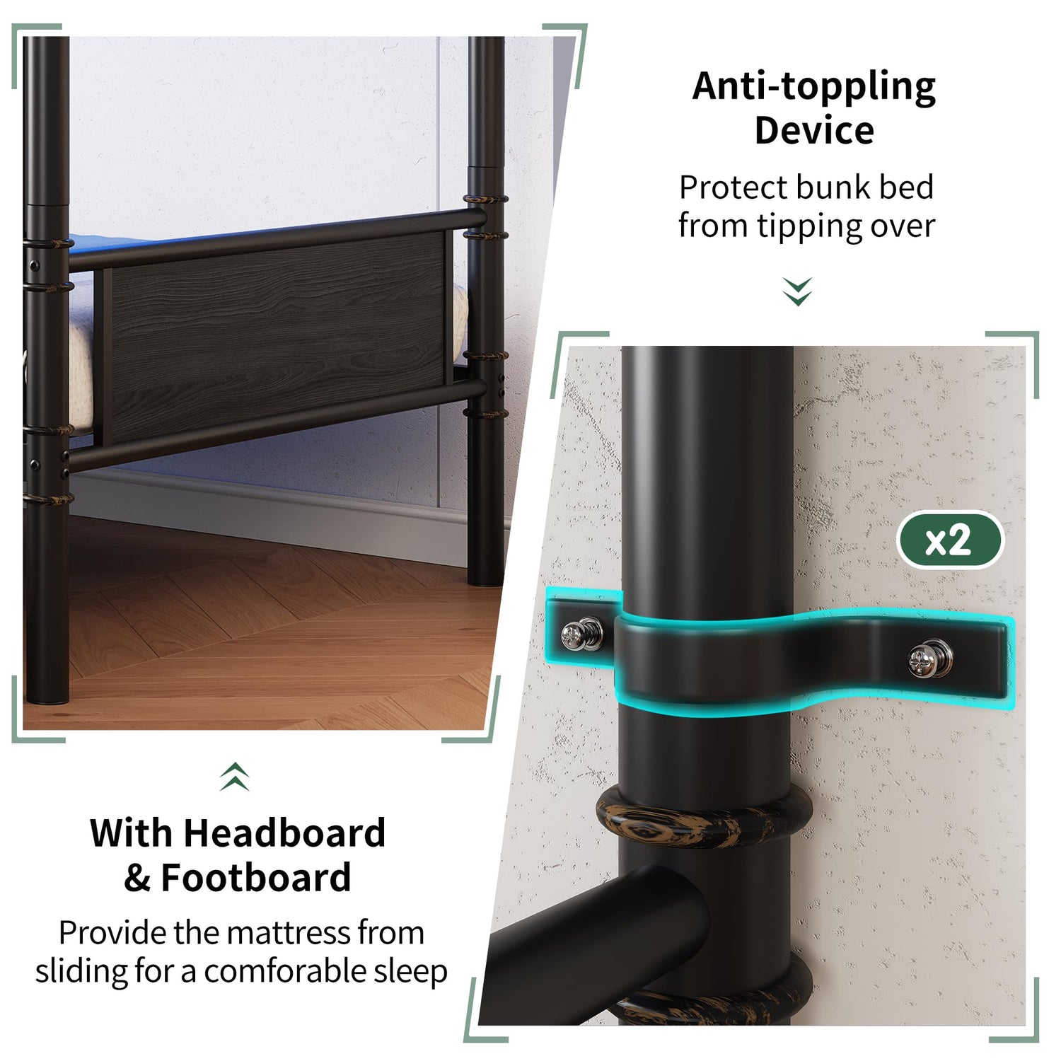 - AESTHETIC APPEAL AND UTILITY: Our Bunk beds are the epitome of practicality and elegance. Constructed with 1.5-inch thick black round metal tubes featuring elegant gold accents, not only visually appealing but are also sturdy and safer for kids without sharp edges like square tubes. The headboard and footboard are crafted with rustic black wood panels, adding a vintage industrial touch to the room. Together, these elements create a unique steampunk-inspired atmosphere, making this twin bunk bed a standout piece for kids, teens, or adults