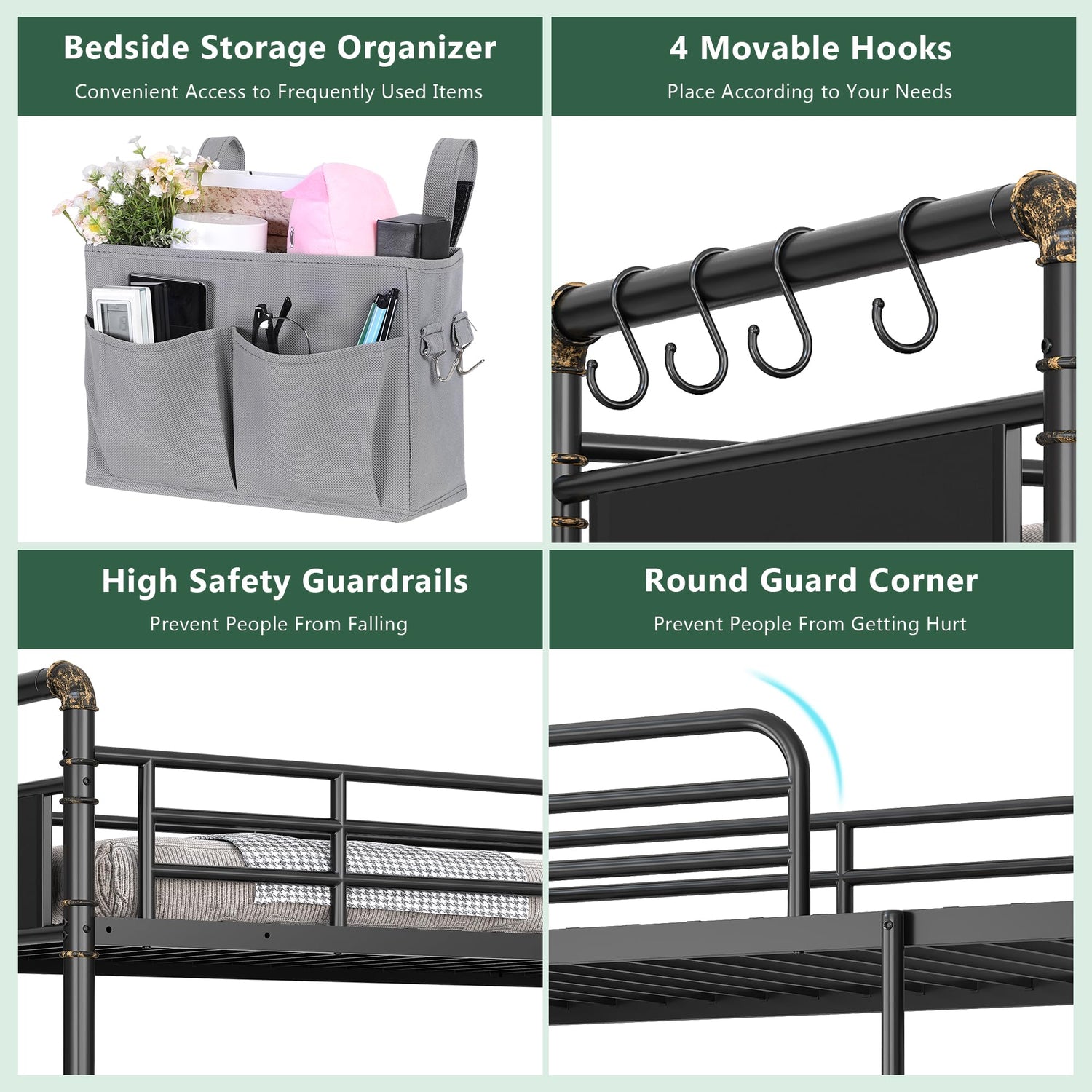 - MULTI-FUNCTIONAL STORAGE SOLUTIONS: This twin over twin bunk bed include a handy bedside storage bag for essentials like phones, books, glasses, chargers and remotes, as well as four hooks for hanging bags, scarves, hats and keys, making the top bunk even more practical. This twin size bed frame maximizes space with two large, silent-glide drawer for easy storage. The locking design keeps drawers securely in place, while the bottom dust mats offer cleaner and stronger support