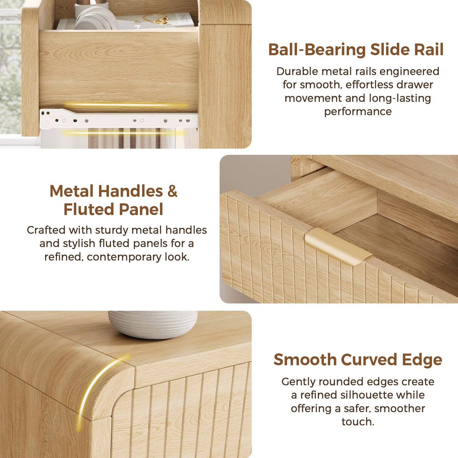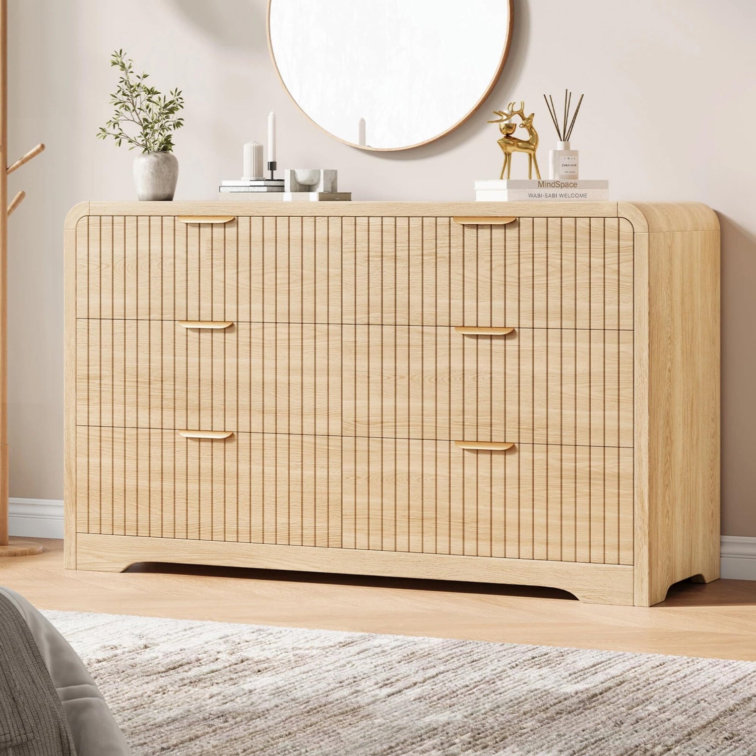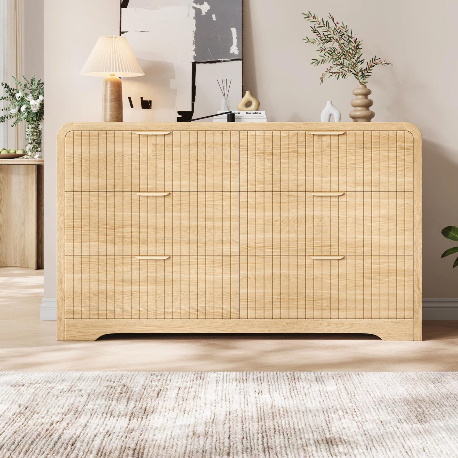 Jocoevol Modern 6 Drawer Dresser, 47" Wide Wood Dressers & Chests of Drawers Curved Profile Design, Mid Century Modern Fluted Dresser for Bedroom, Natural Oak