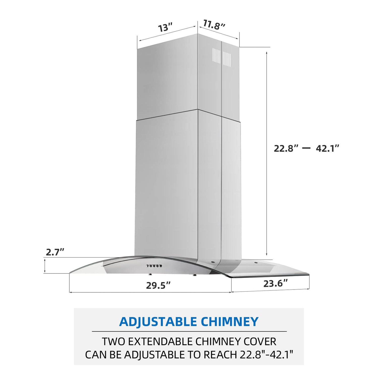 - 【Range Hood Specifications】: 30"(W) × 23.6"(L) × 22.8"-42.1"(adjustable height). The 30-inch island range hood is usually designed to enhance your cooking experience on the island kitchen counter, providing impeccable ventilation through the adjustable chimney located on the kitchen countertop in the center of the kitchen.