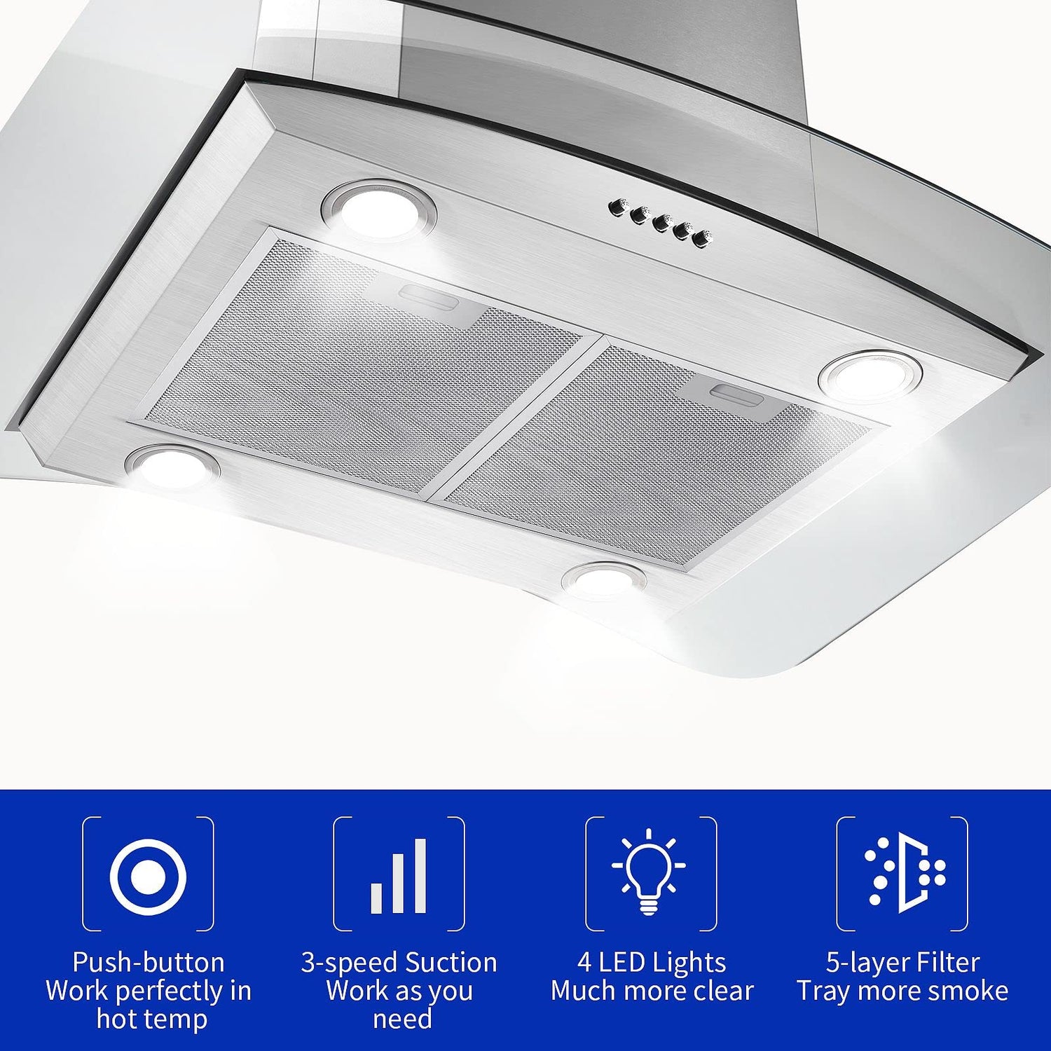 - 【Top Quality】: This island mounted range hood is made of 430 brushed stainless steel and curve tempered glass, it has excellent corrosion and rust resistance. The brushed stainless steel finish prevents dents and scratches and can be used for a long time in a busy kitchen. Two pcs 5-Layer aluminum grease filter can be easily maintained and cost-saving just by putting them in the dishwasher.