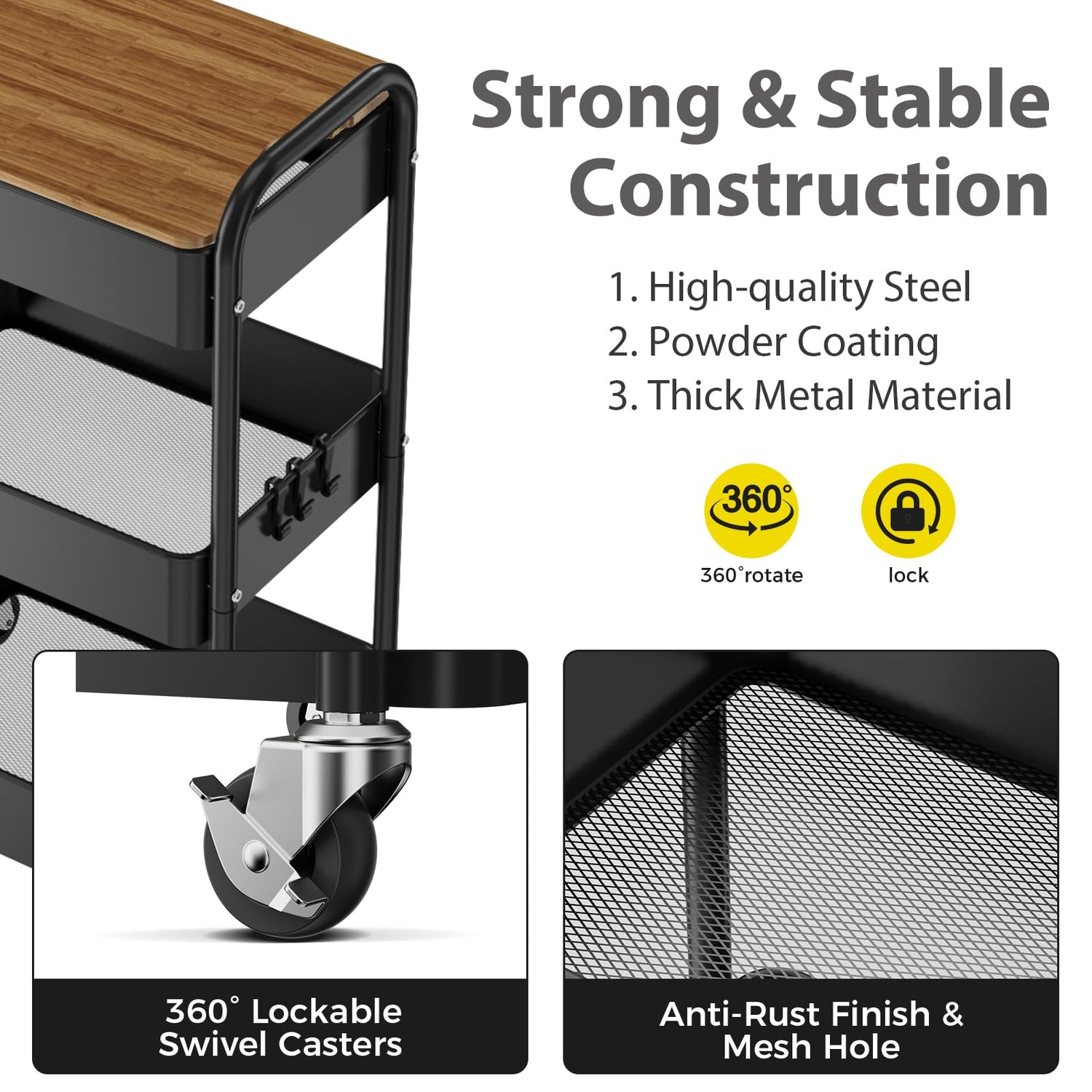 johgee 3 Tier Rolling Cart with Table top, Metal Utility Cart, Sturdy Storage Organizer Cart with Locking Wheels & Hooks for Office, Classroom, Kitchen and Bathroom