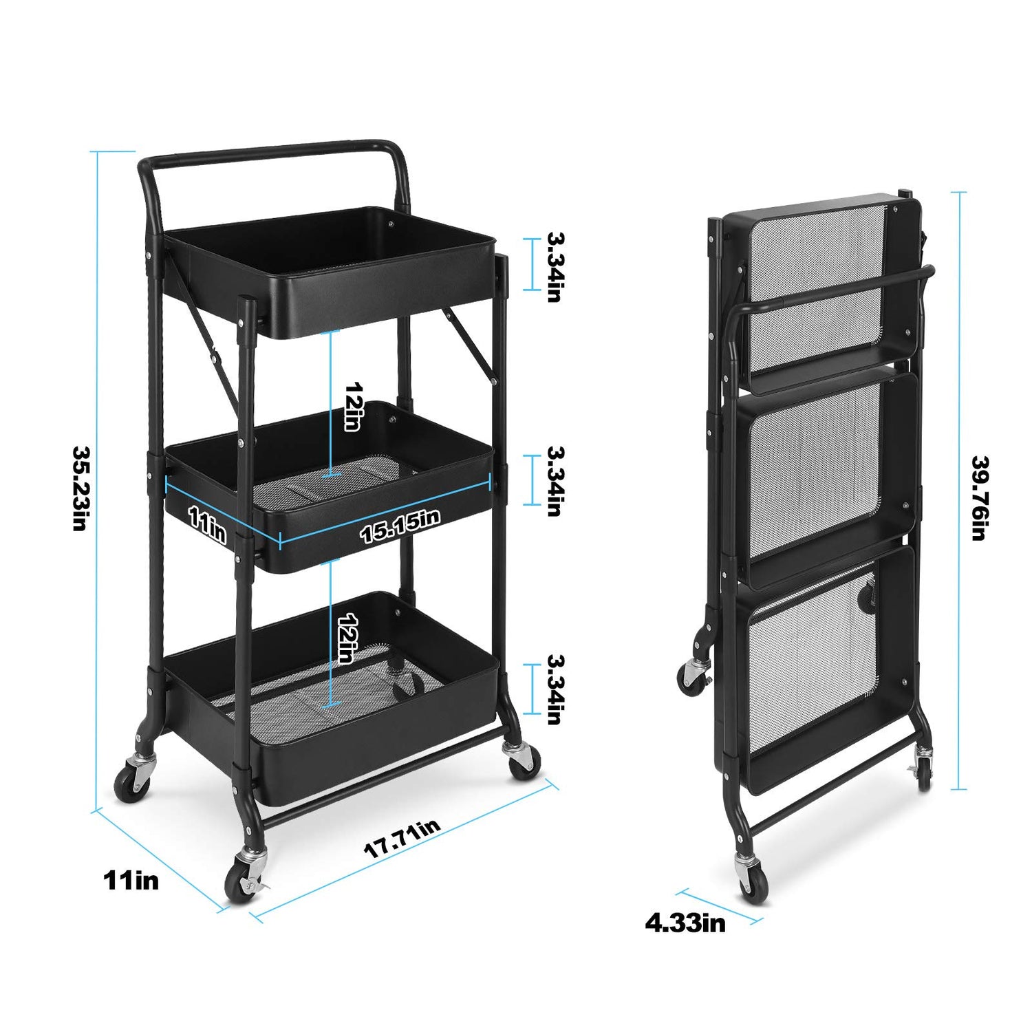- 💖 【Large Storage Capacity & Breathable Design】3-tier utility cart provides large-capacity storage baskets which is 16"" L x 13.5"" W x 3.25"" H. The depth of each shelf is 3.3 inches to prevent items from falling. The design of mesh baskets can not only prevent odors from accelerating drainage and easy cleaning.
