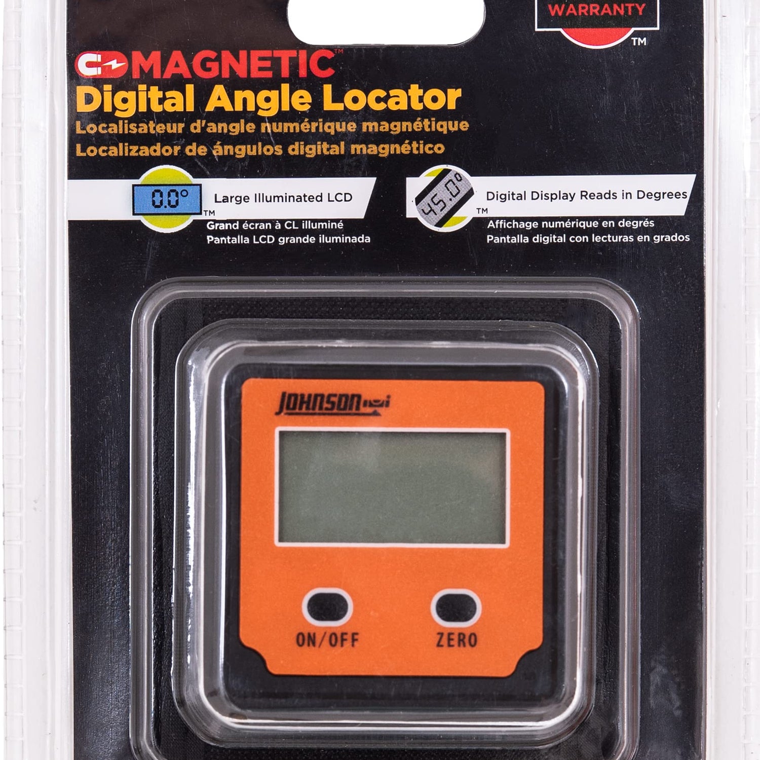 Details: Check and transfer angle measurements easily and accurately with Johnson's compact magnetic digital angle locator. This tool easily and clearly displays angles in degrees from 0° to 90°, in both absolute and relative measurements, making your job go faster and more accurately. It features an automatic LCD backlight for easy visibility, and the reading will automatically invert when you're taking overhead measurements. This angle locator comes with a soft-sided pouch to keep it clean and safe when not in use.