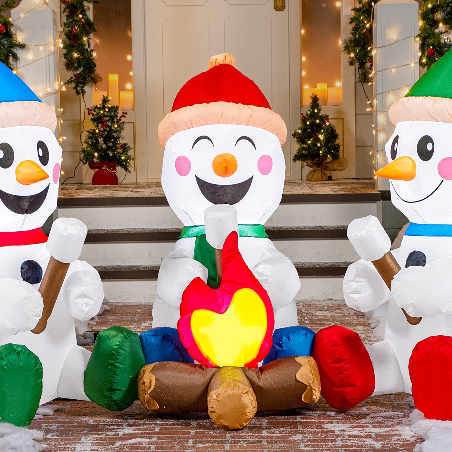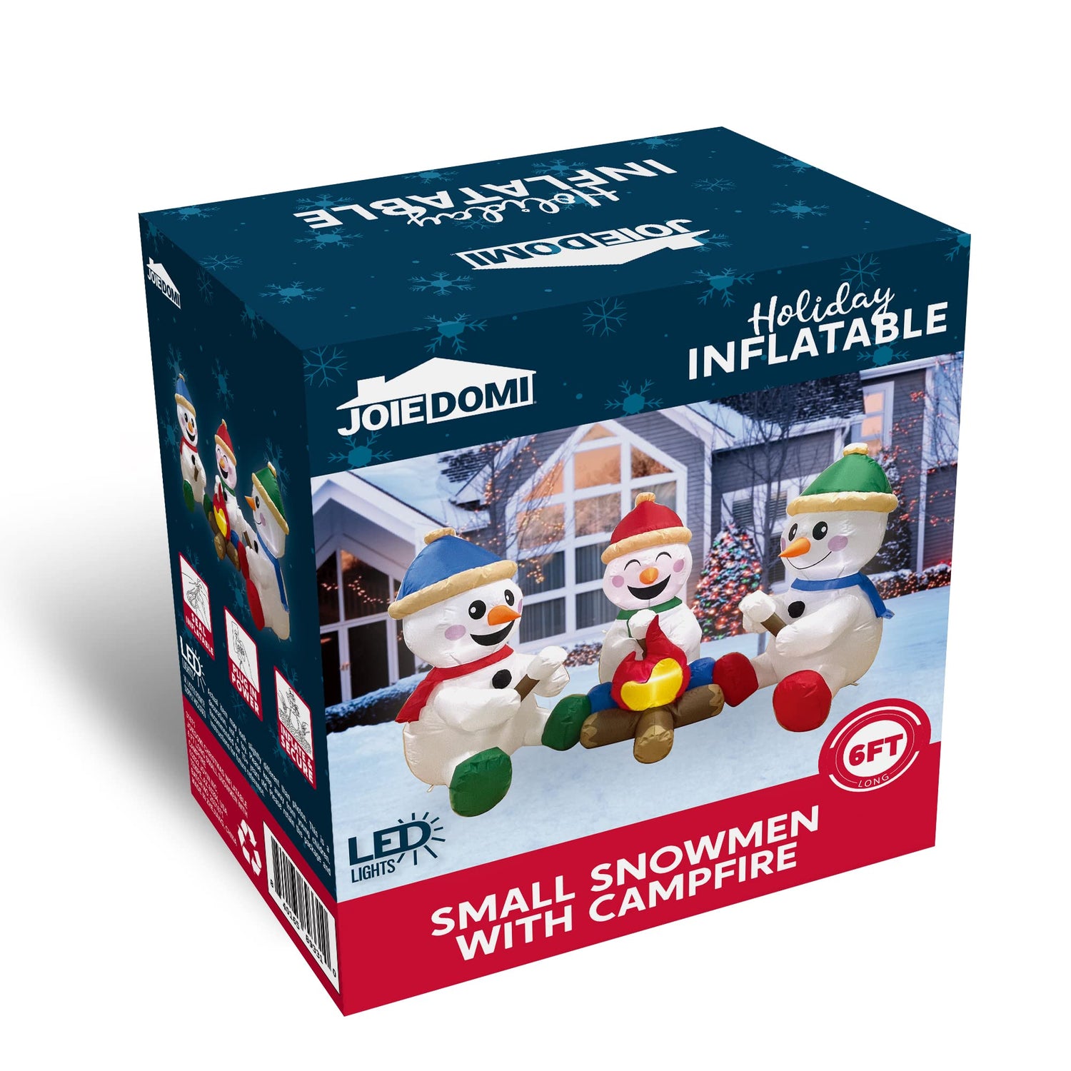 - FESTIVE DESIGN. Joiedomi 6 feet Long Small Snowmen with Campfire Christmas Inflatable inflatable comes with an extended cord, ground stakes, fastened ropes, built-in sandbags, and a plug with UL certification.