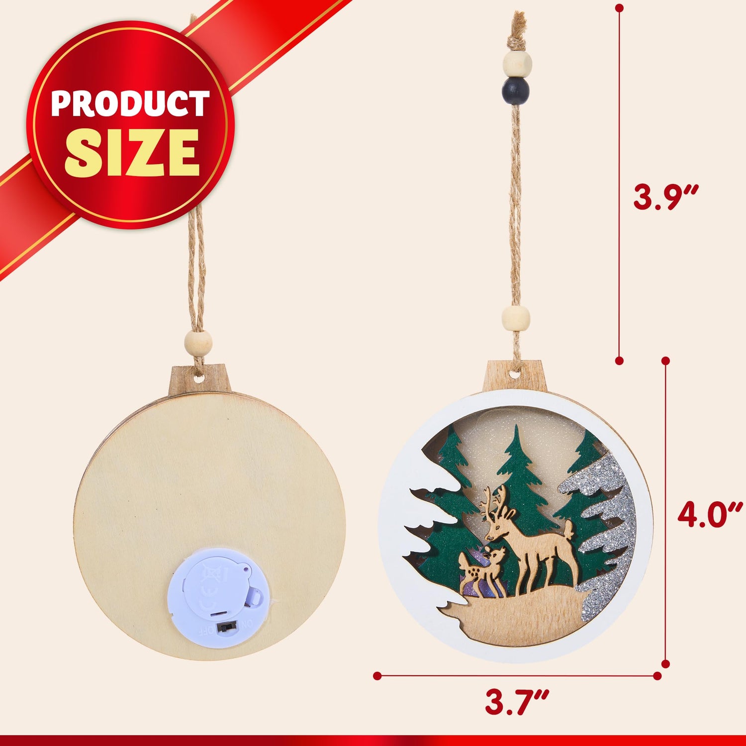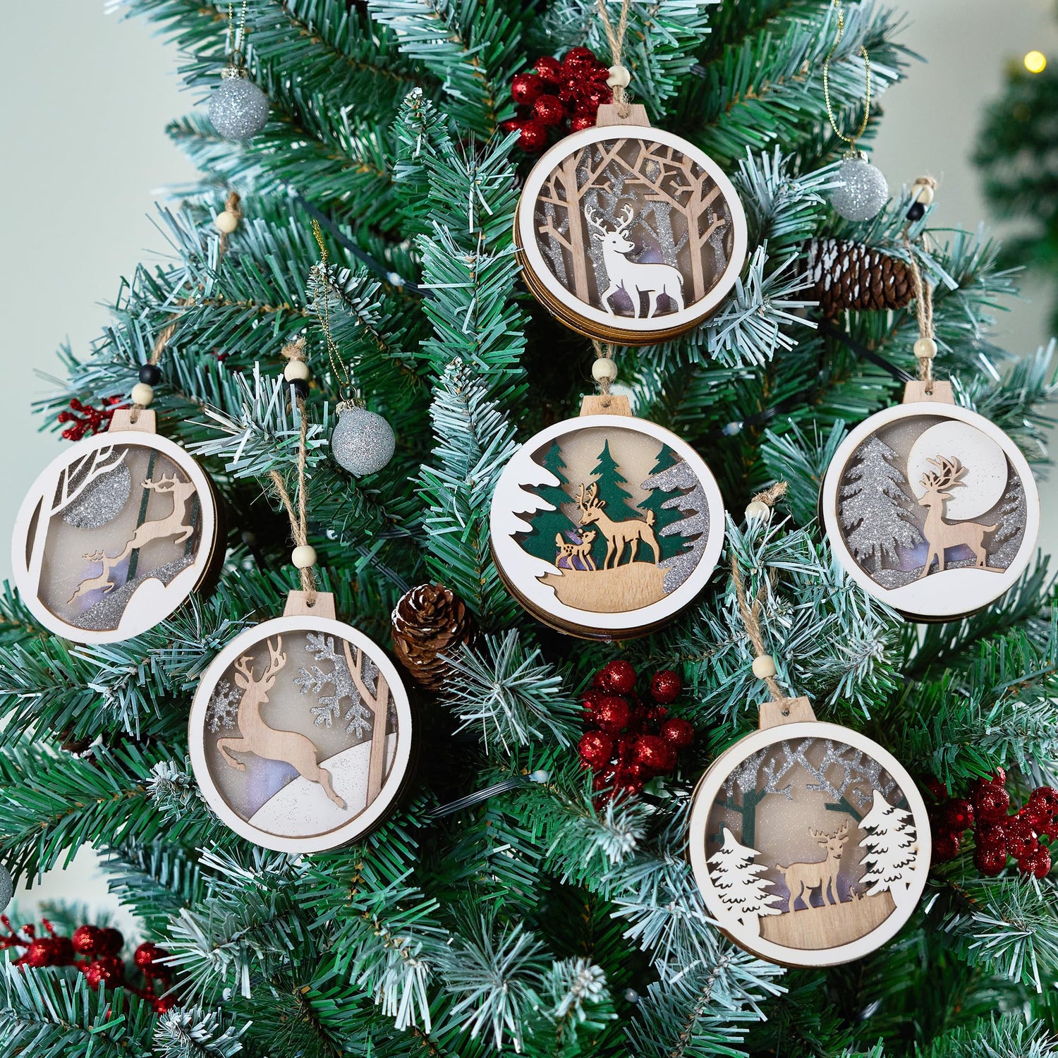 - SUPER VALUE PACK. Add a touch of whimsy to your Christmas decor with our 6 pcs LED wooden reindeer hanging ornaments. Each set includes 6 delightful designs of wooden reindeer ornaments, measuring around 3.7 inches in diameter. Let these adorable reindeer ornaments light up your holiday celebrations!