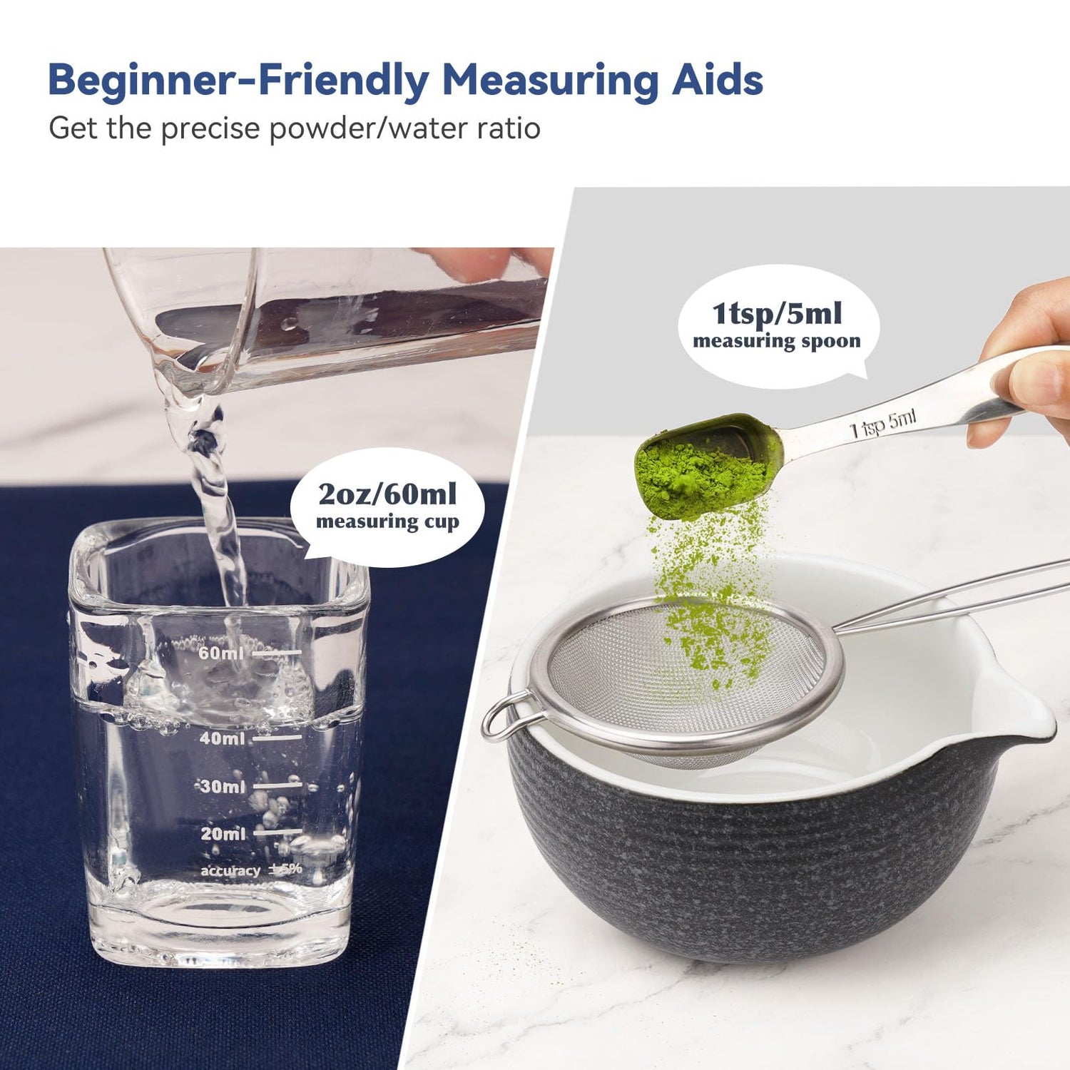 • Beginner-Friendly Measuring Aids: The matcha starter set contains a stainless steel measuring spoon (1tsp/2g) and measuring glass (2oz/60ml) to help you easily get the precise powder/water ratio whether when making standard matcha flavor or exploring the unique taste to your liking (Note: Measuring cup is not microwavable)