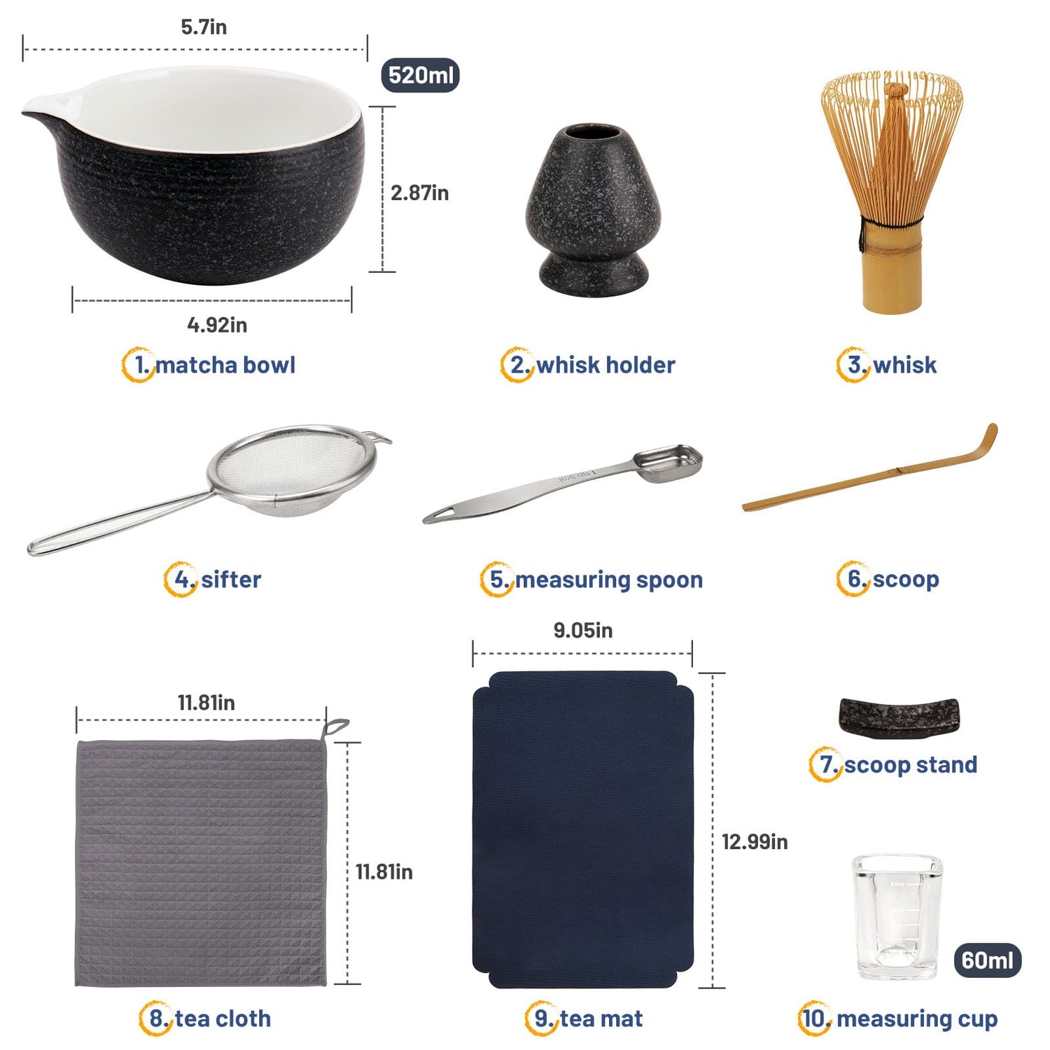 • 10-Piece Matcha Tool Set: It contains a complete set of 8 matcha making tools and 2 measuring implements. Designed after traditional Japanese matcha utensils, this matcha kit helps make authentic Japanese matcha for matcha lovers, taking you through the elegant, traditional way of tea tasting (This bowl and whisk set includes no green tea powder)