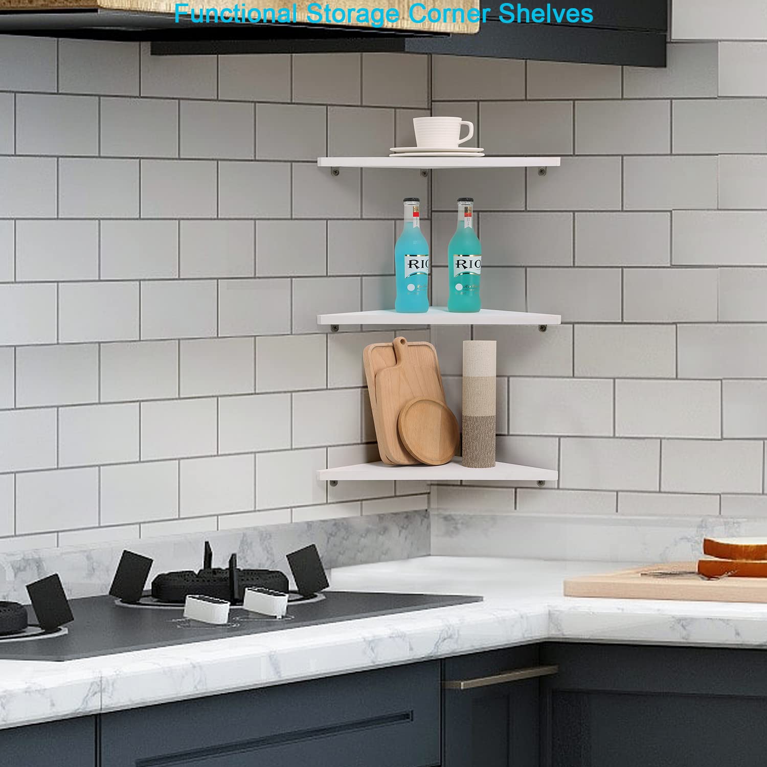 Joiishom Corner Wall Shelf Set of 3, Floating Corner Shelves for Wall, Rustic Wood Wall Storage Display Shelves for Living Room Bedroom Bathroom Kitchen (White)