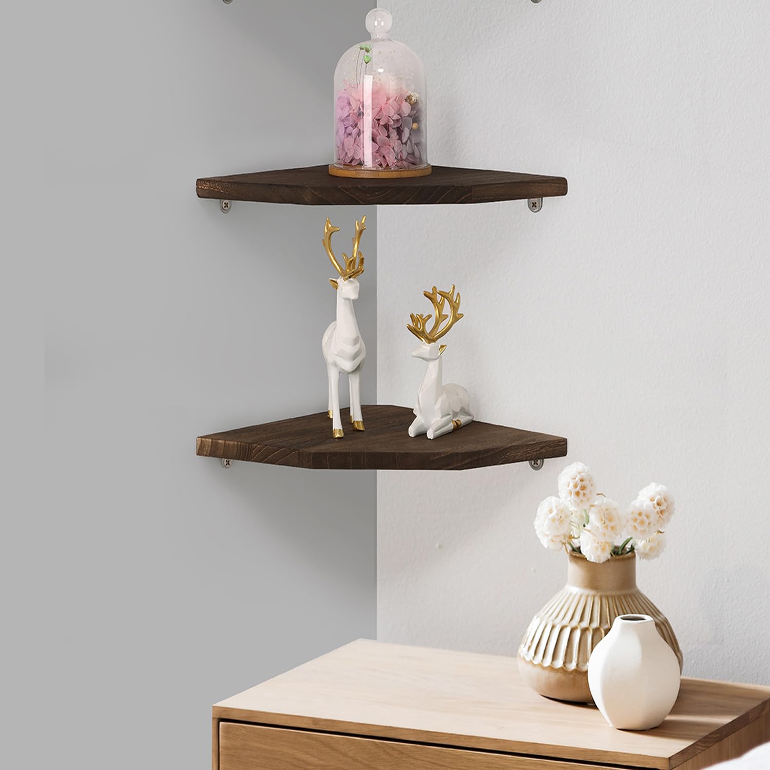 - Solid Wood Corner Wall Shelf: These corner wall shelves are designed with natural wood and stainless steel brackets, made of 100% Premium Solid Pine Wood, green and pollution-free. Our sturdy and beautiful corner shelves are suitable for any corner of your room to display your favorite decorative items.
