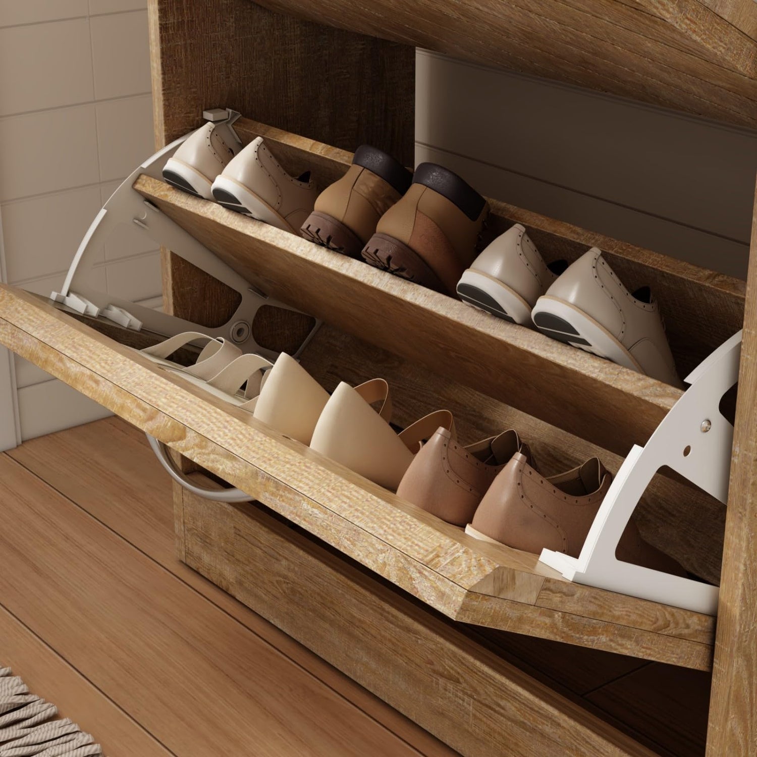 - Flip Drawers Shoe Cabinet -This shoe cabinet features 3 flip drawers, each with 2-layer storage. Shelves are adjustable and detachable, fitting to various shoe types, while the tabletop can hold daily items like keys or umbrellas. Note: the capacity may vary based on shoe style and size. Please check the product size carefully to ensure your shoes fit our cabinet.