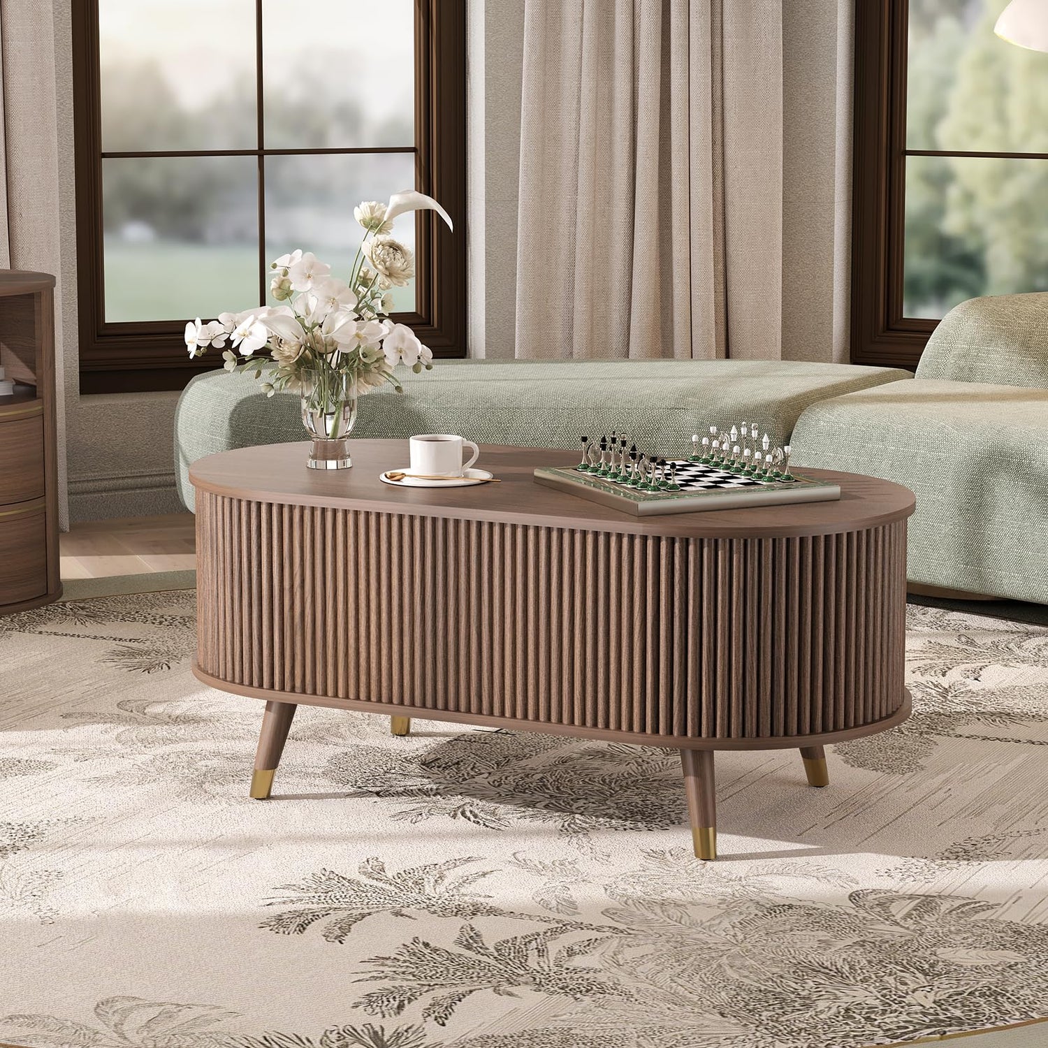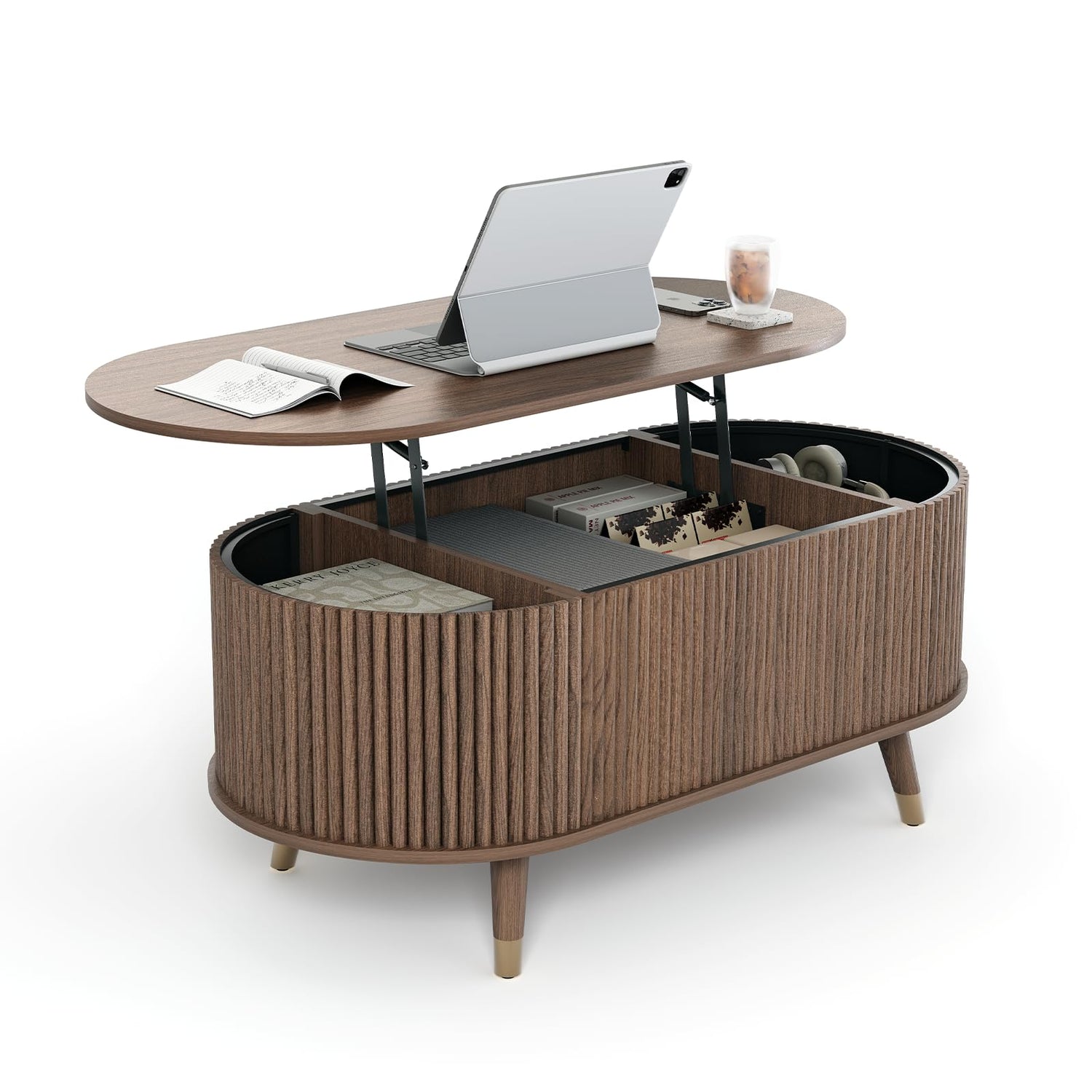 JOINICE 42.5" Oval Lift Top Coffee Table with Storage, Mid Century Modern Walnut Center Table with Fluted Design, Solid Wood Legs & Hidden Compartment, Pop Up Cocktail Table for Living Room