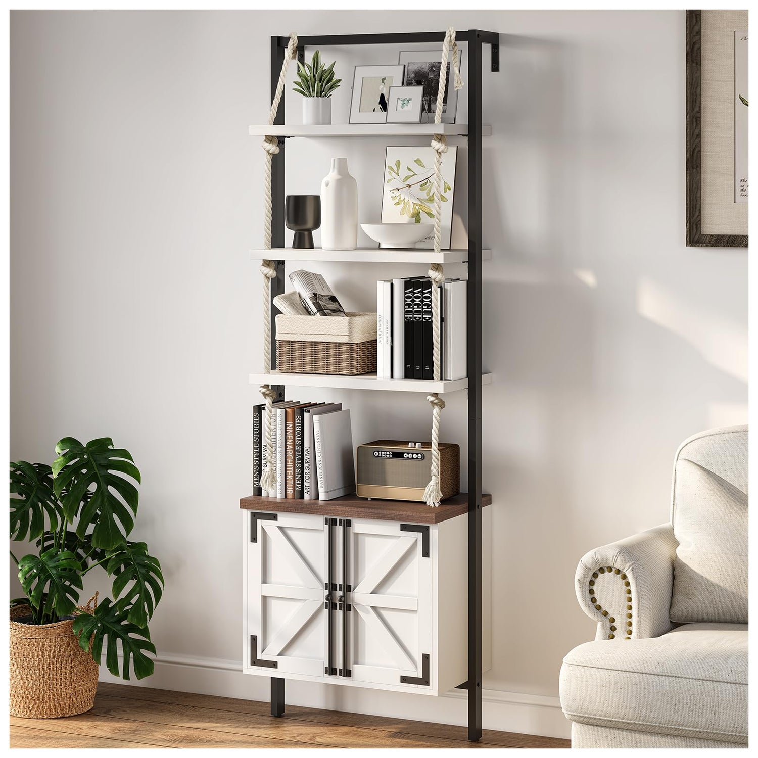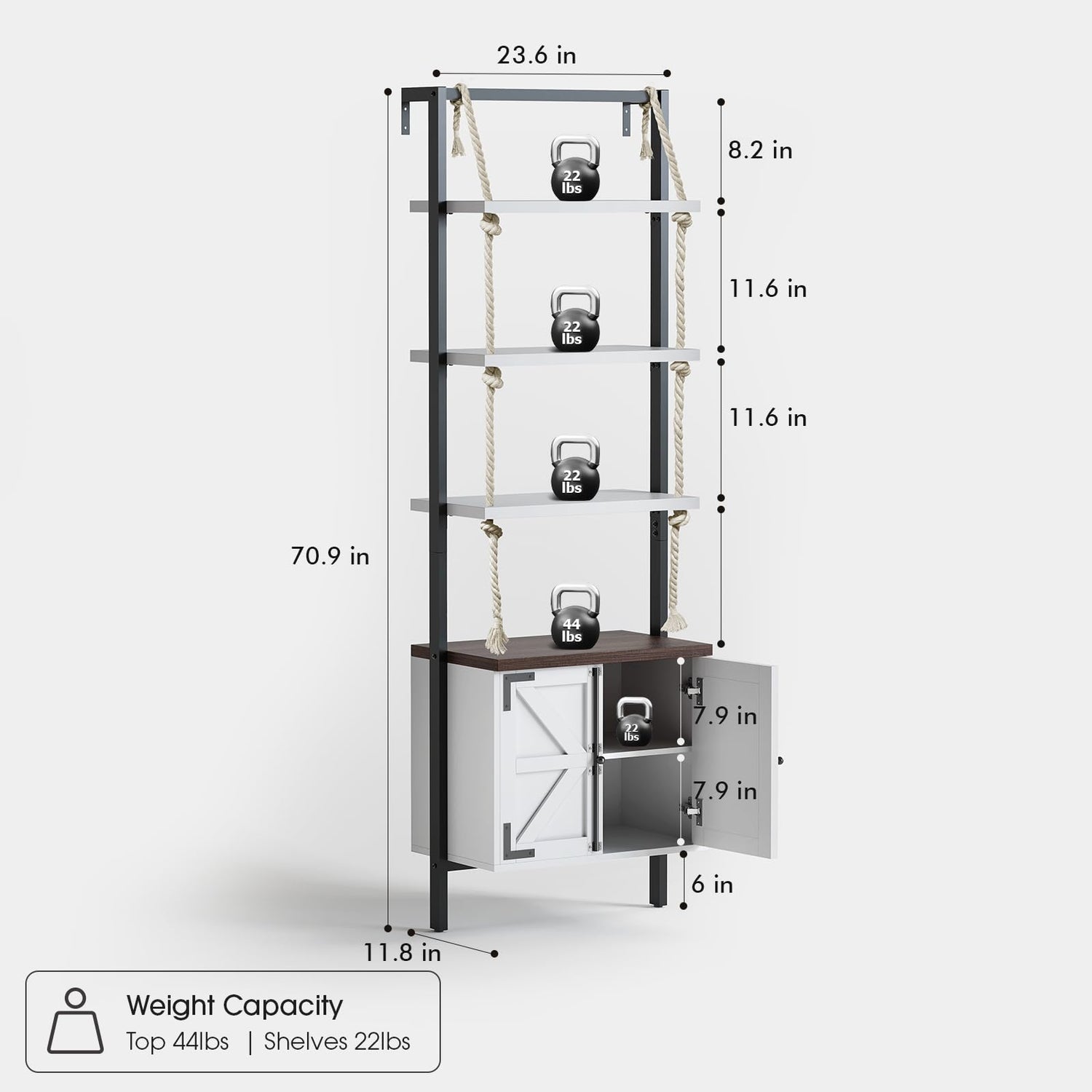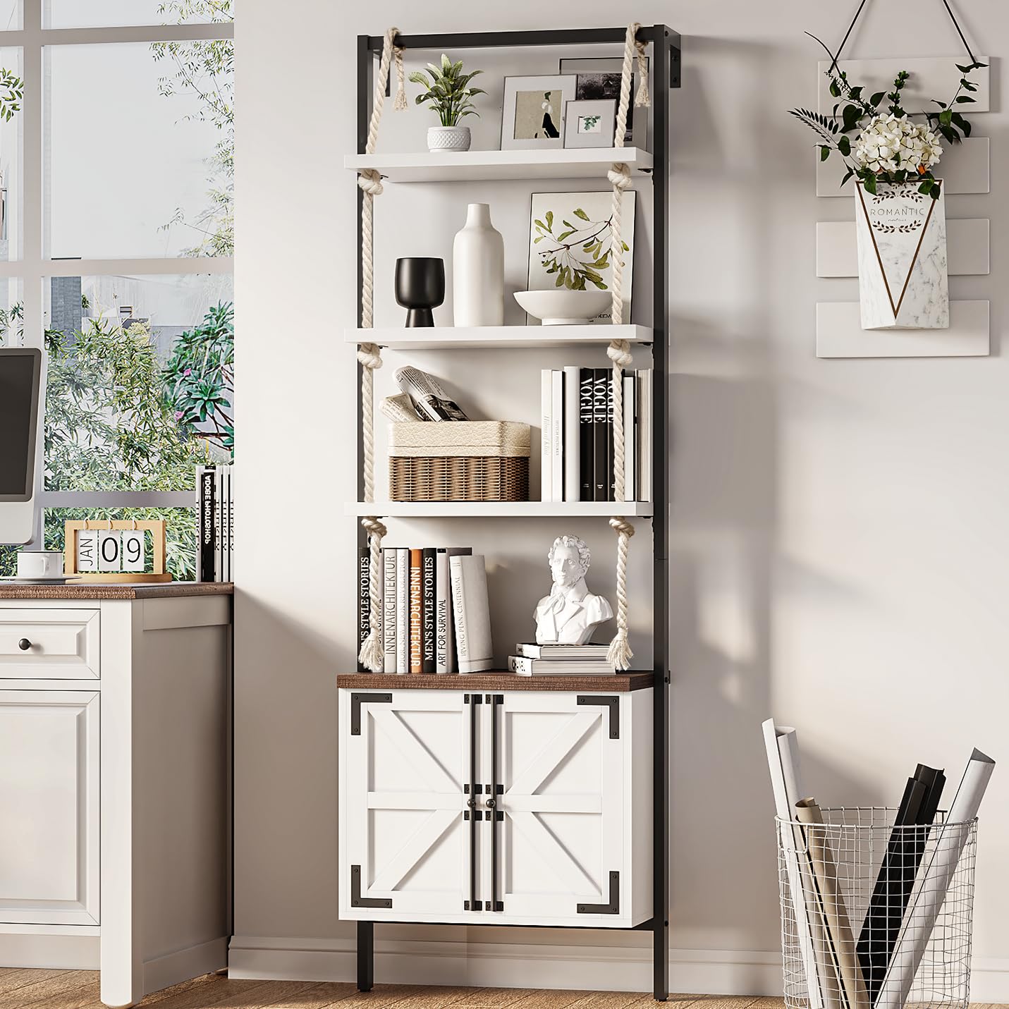 JOINICE,Farmhouse Bookshelf with Storage,71" Tall Industrial Bookcase with Shelves and Cabinet,5 Tier,Wall Mounted Ladder Shelf with Display Rack for Bedroom,Living Room,White