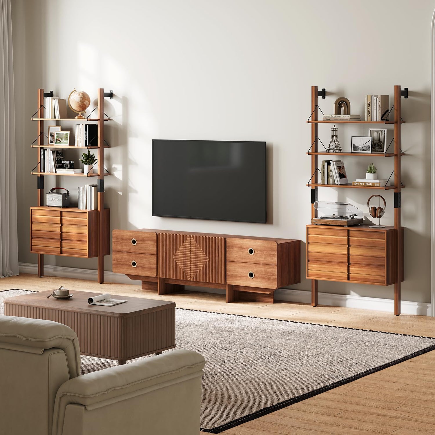 - 【Unique Design,Showing Style】Elevate your living space with this chic JOINICE Bookshelf,a perfect blend of mid century modern design and practicality.Its tall,wall mounted structure saves valuable floor space and adds a touch of sophistication to any room