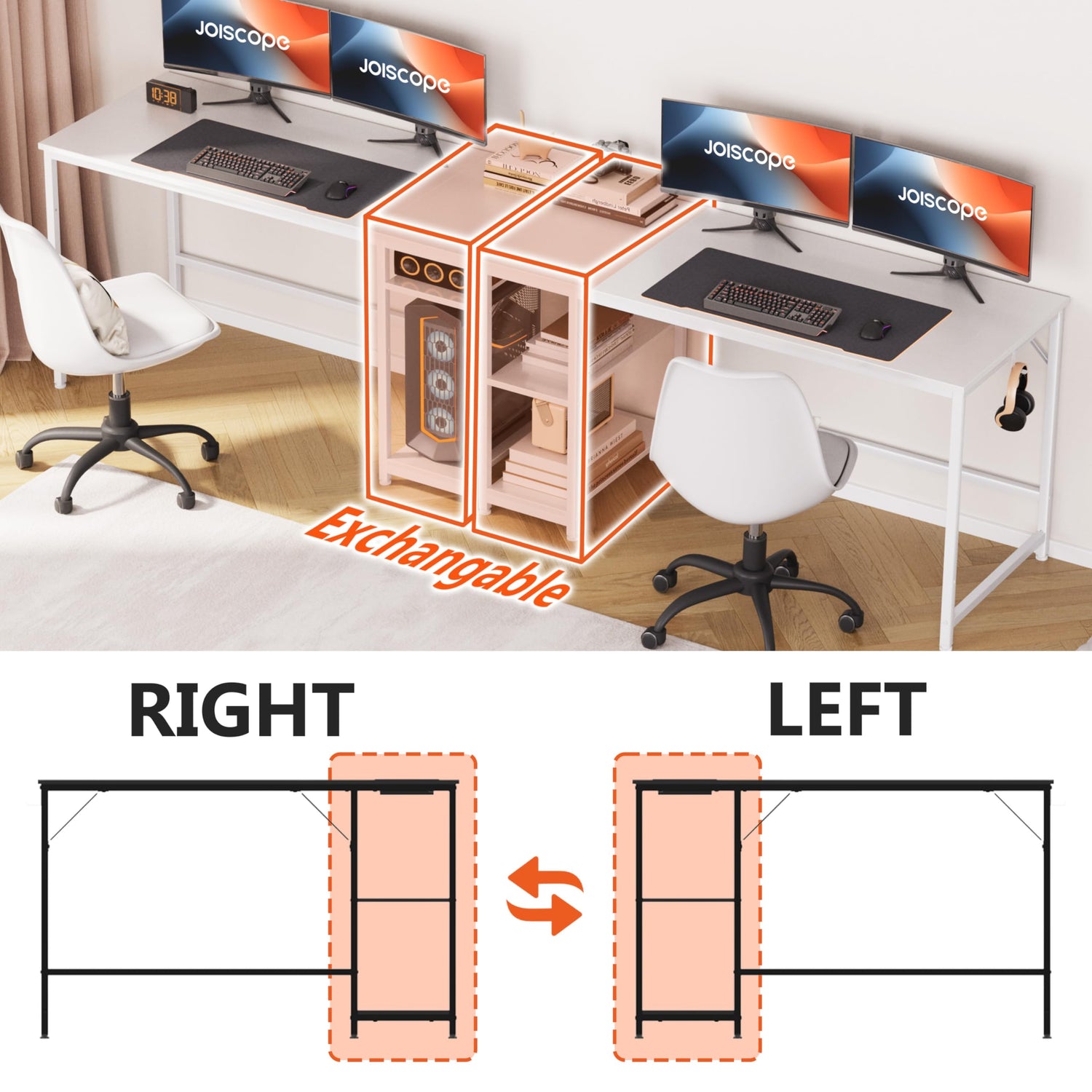 JOISCOPE Home Office Desk with Double Reversible Side Shelves and Headphone Hooks, Computer Desk for Working, Gaming, Studying, 60 inches, White