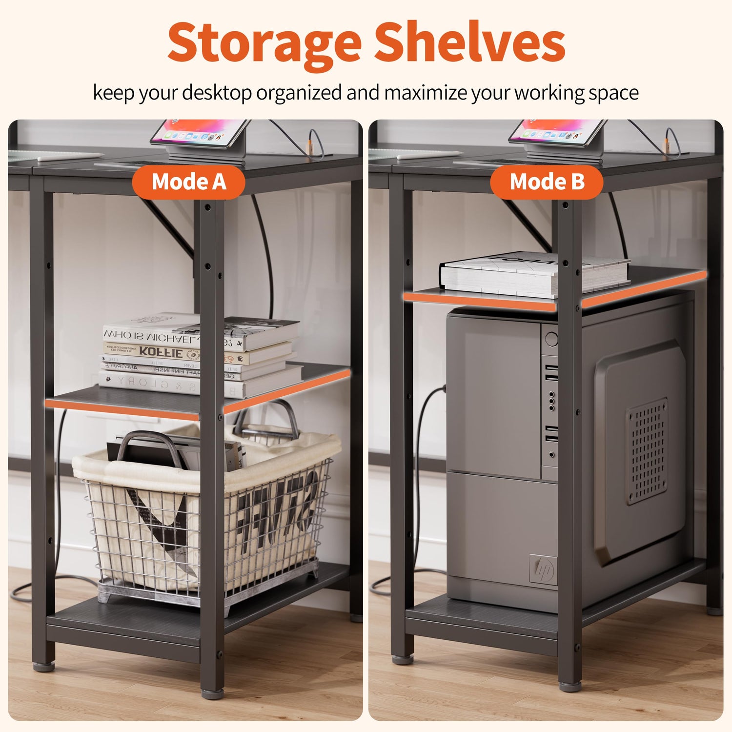 - 【DIY Installation Shelves】The side shelves features 2 adjustable layers with a the weight capacity of up to 100lb each. It not only can the left and right installation adjustment, but also can be installed up and down,offering additional storage space for a host or books. An extra hook with a 25lb load capacity is the first choice for hanging items. Whether you are working from home, gaming, or engrossed in studying or writing, this computer desk is ideal.