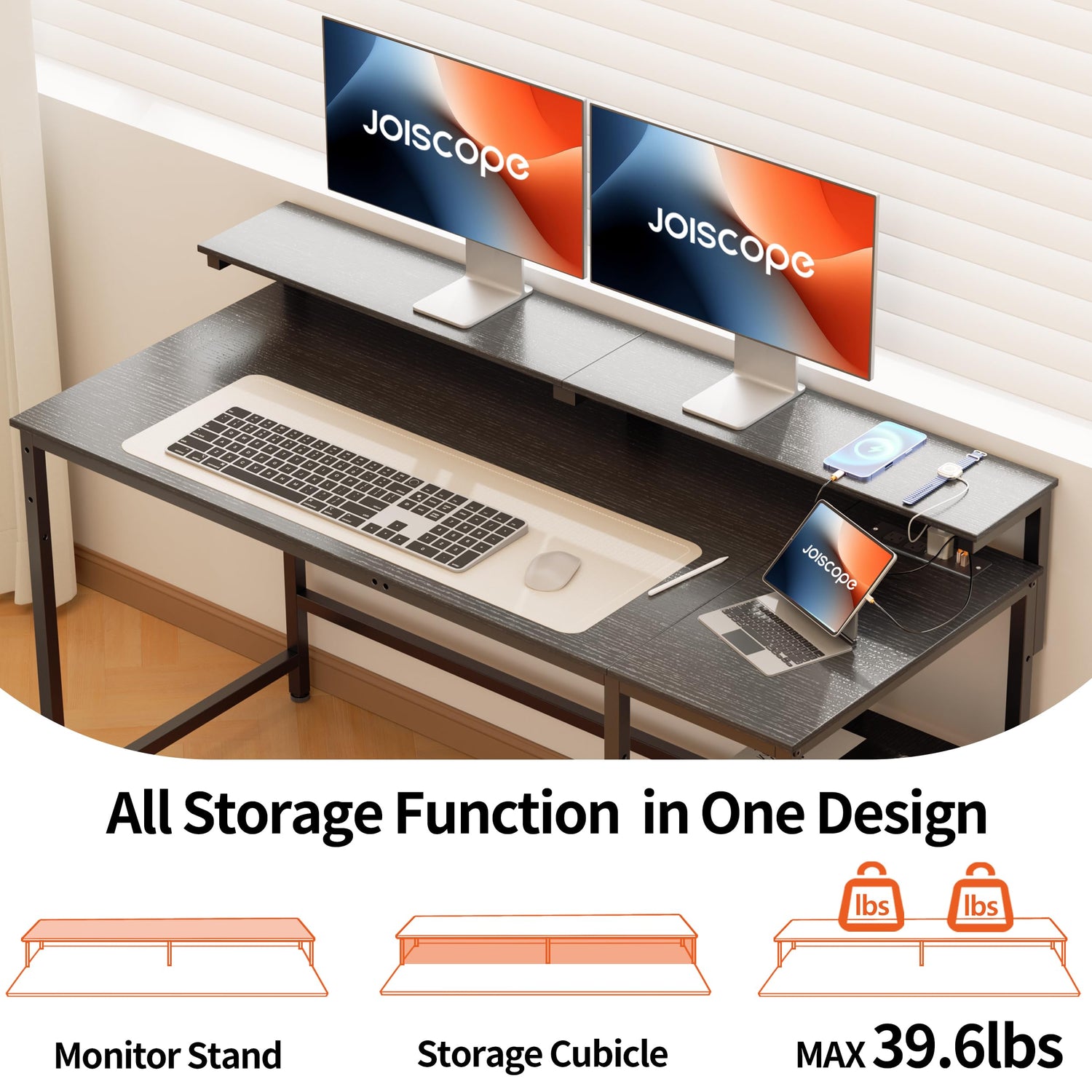 - 【Ergonomic Display Riser】 The JOISCOPE desk features a perforated display riser that can bear up to 40 lb, increasing the desktop storage space and raising the height of the monitor to an ergonomic level. This design not only keeps your workspace organized and orderly but also aligns the top of the monitor with your eye level when seated. By doing so, it helps to reduce neck strain and maintain a comfortable posture, thus protecting your cervical spine during long hours of work.