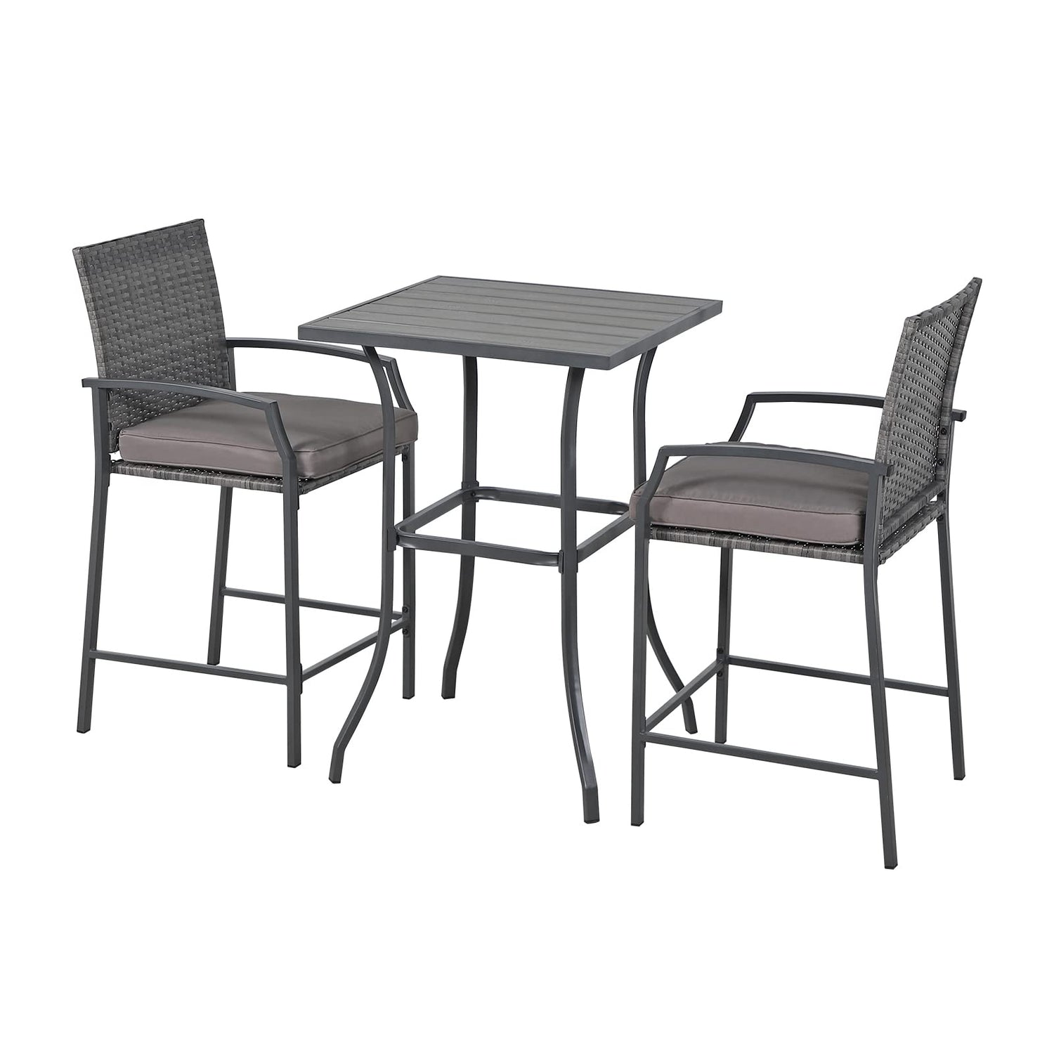 - Sturdy & Stable - Equipped with anti-slip pads, the chairs and table maintain stability and protect your floors from scratches. With a table load capacity of 120 lbs and chairs supporting up to 330 lbs, it's built to accommodate guests in any outdoor setting securely. Bar Table Dimension: 27.6" L x 28.7" W x40.2" H; Bar Chair Dimension: 22.8" L x 22.8" W x 44.1" H.