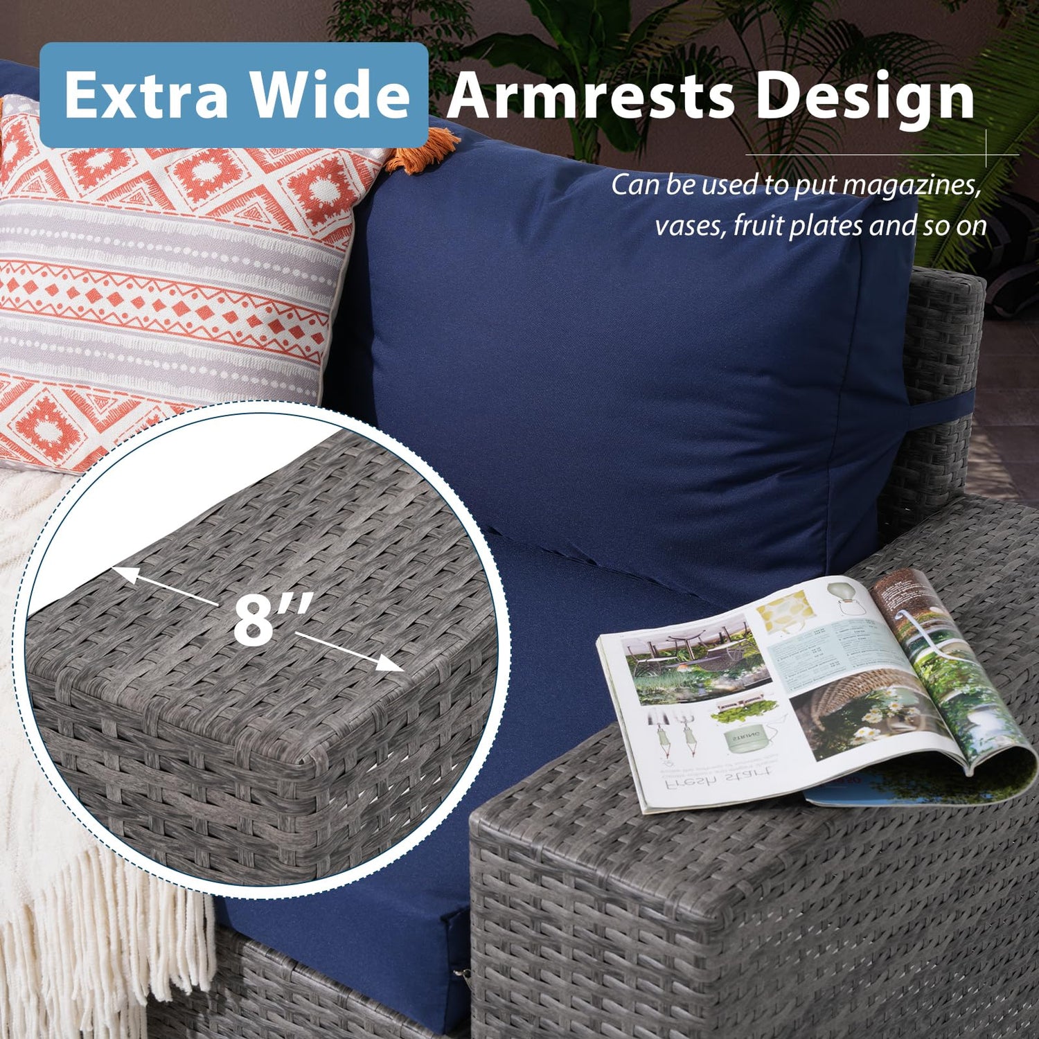 - Enhanced Comfort with 8” Wide Armrest: Our 7-Piece outdoor sectional sofa set greatly increases the width of the armrests. The 8-inch width not only provides a super-comfortable resting place for your hands, but it can also be used as a side table for laptops, coffee, books, and etc.,