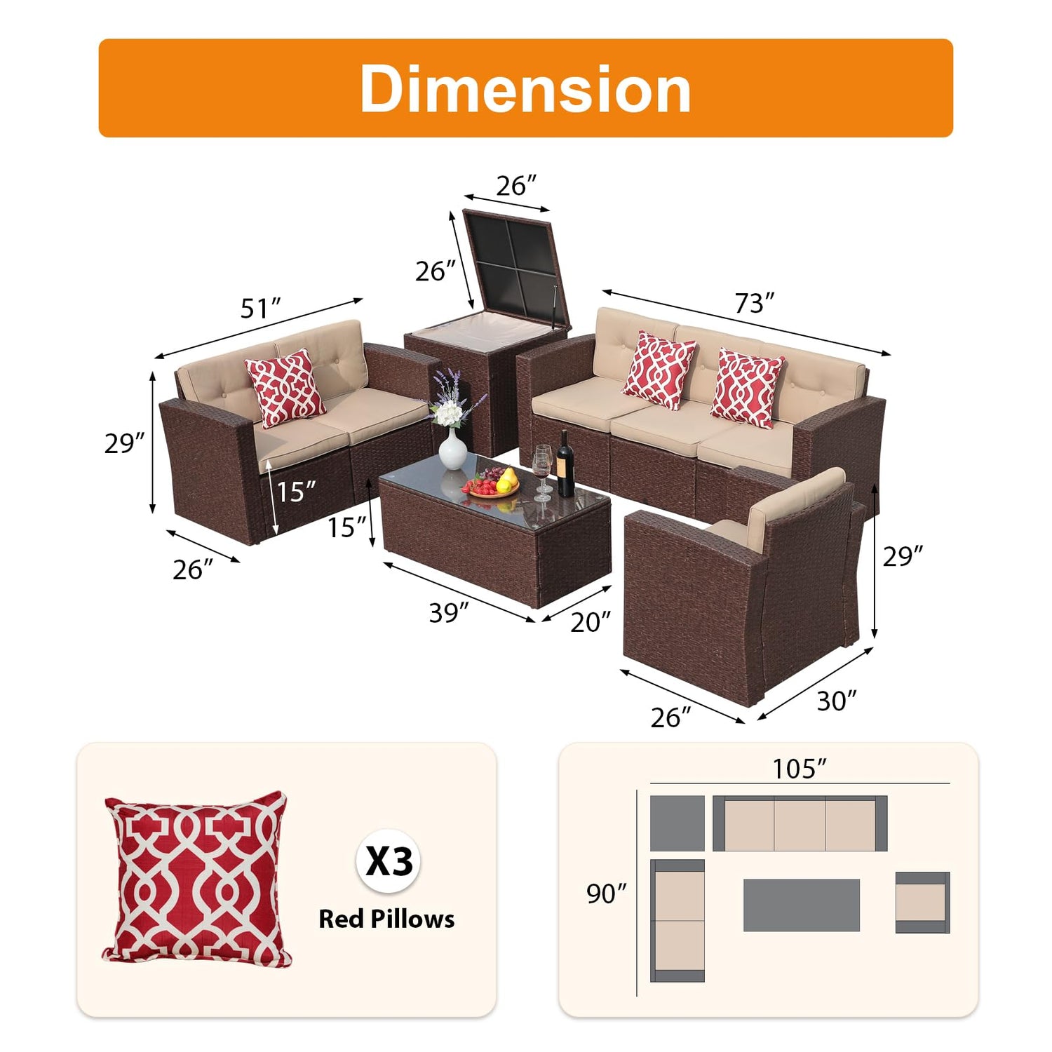 - [Shipped in 4 Packages] - This outdoor conversation sectional sofa set comes in 4 boxes, including 4 x corner sofa, 1 x Armchair sofa, 1 x armless sofa, 1 x coffee table, 1 x storage box, 6 x seat cushions, 6 x back cushions, and 3 x throw pillows. Easy to assemble. And please carefully check the dimension of the sofa when you place the order.