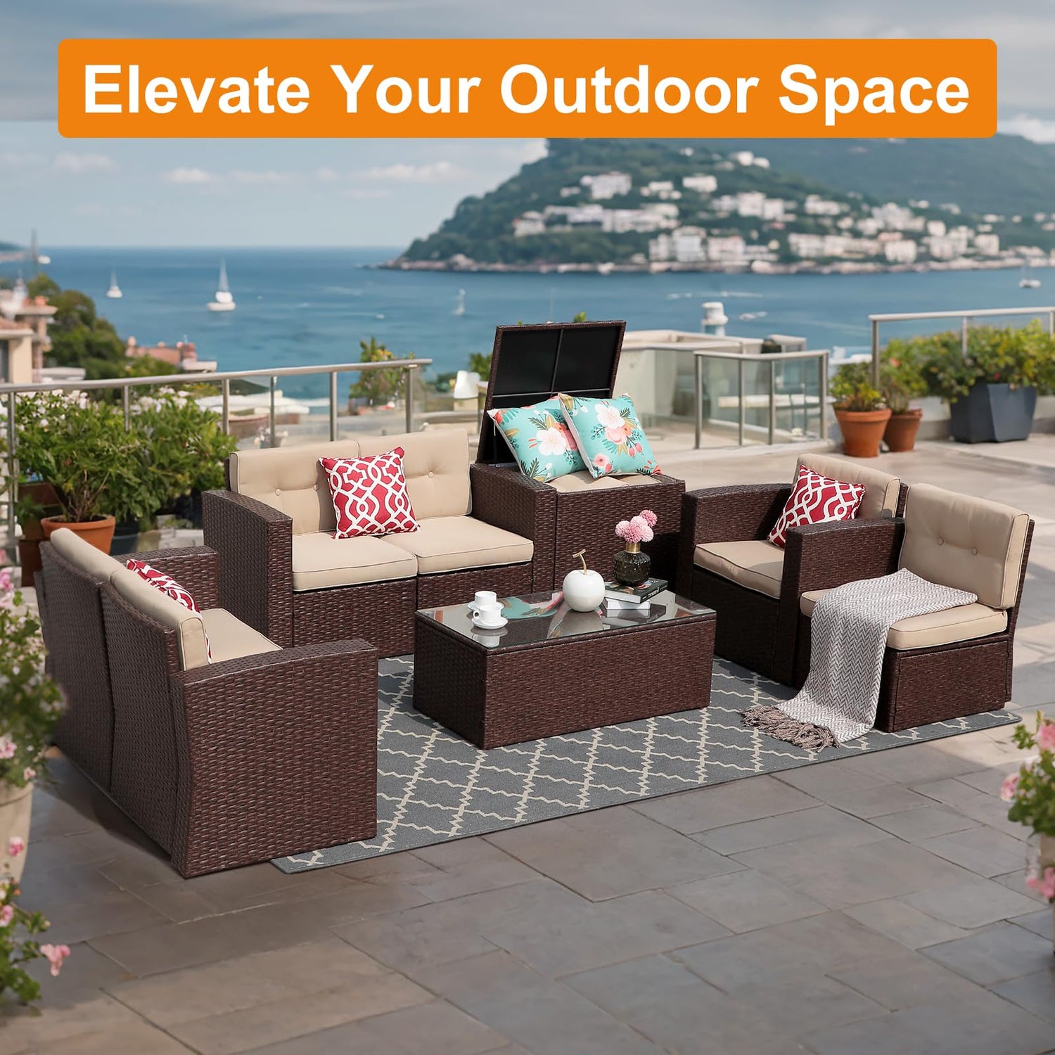 JOIVI 8 Pieces Patio Conversation Sets, All Weather Outdoor Sectional Patio Sofa, U-Shaped PE Wicker Patio Furniture Sets with Storage Box, Coffee Table, 3 Pillows, for Garden, Porch, Brown