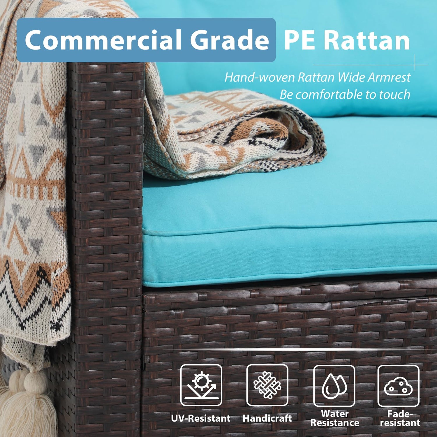 JOIVI Outdoor Wicker Sectional Furniture Set, 3 Piece Patio Furniture with Tempered Glass Coffee Table, Turquoise