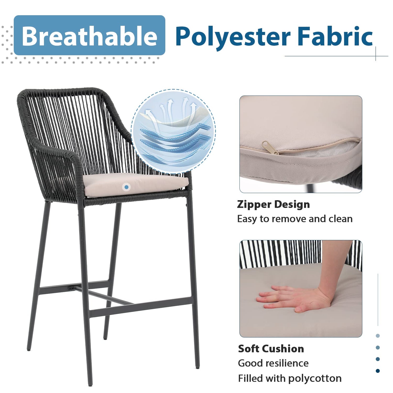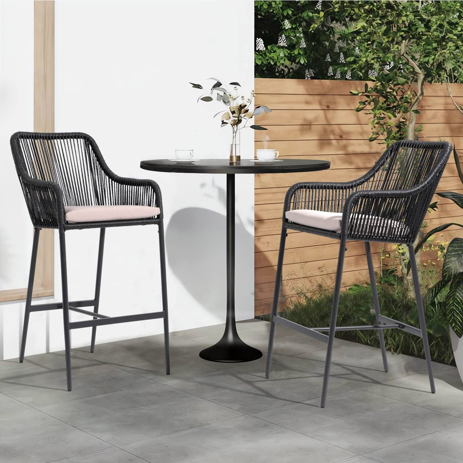 JOIVI Wicker Bar Stools Set of 2, Patio Outdoor Rattan Rope Bar Height Chairs with Cushions, Armrest and Footrest for Indoor, Garden, Poolside, Lawn, Backyard, Black