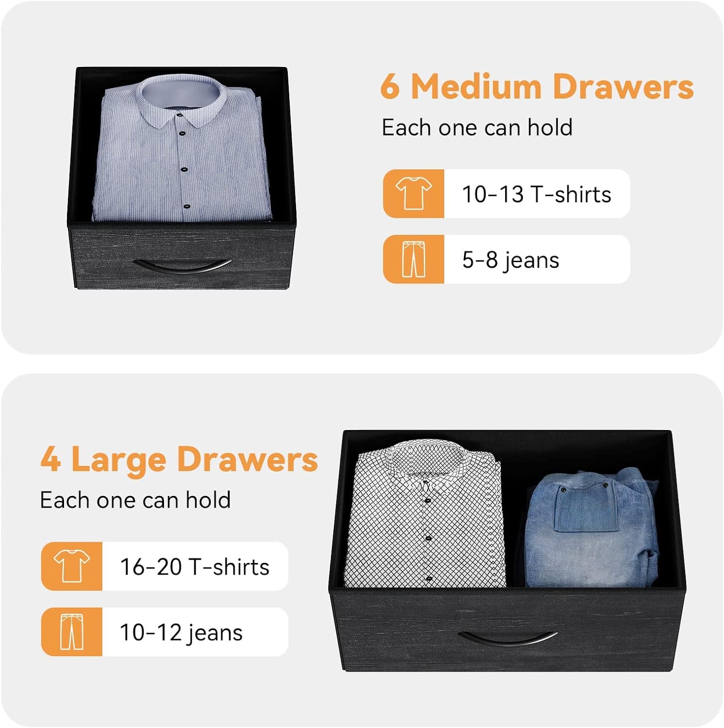 - 10 Dresser for Bedroom: The wide dresser for bedroom is designed with 10 individually collapsible drawers, including 6 medium-sized drawers for medium and small items, 2 large drawers with 2 compartments for medium size items, and 4 large size drawers for Large size items. Jojoka chest of drawers offers endless organizational possibilities.